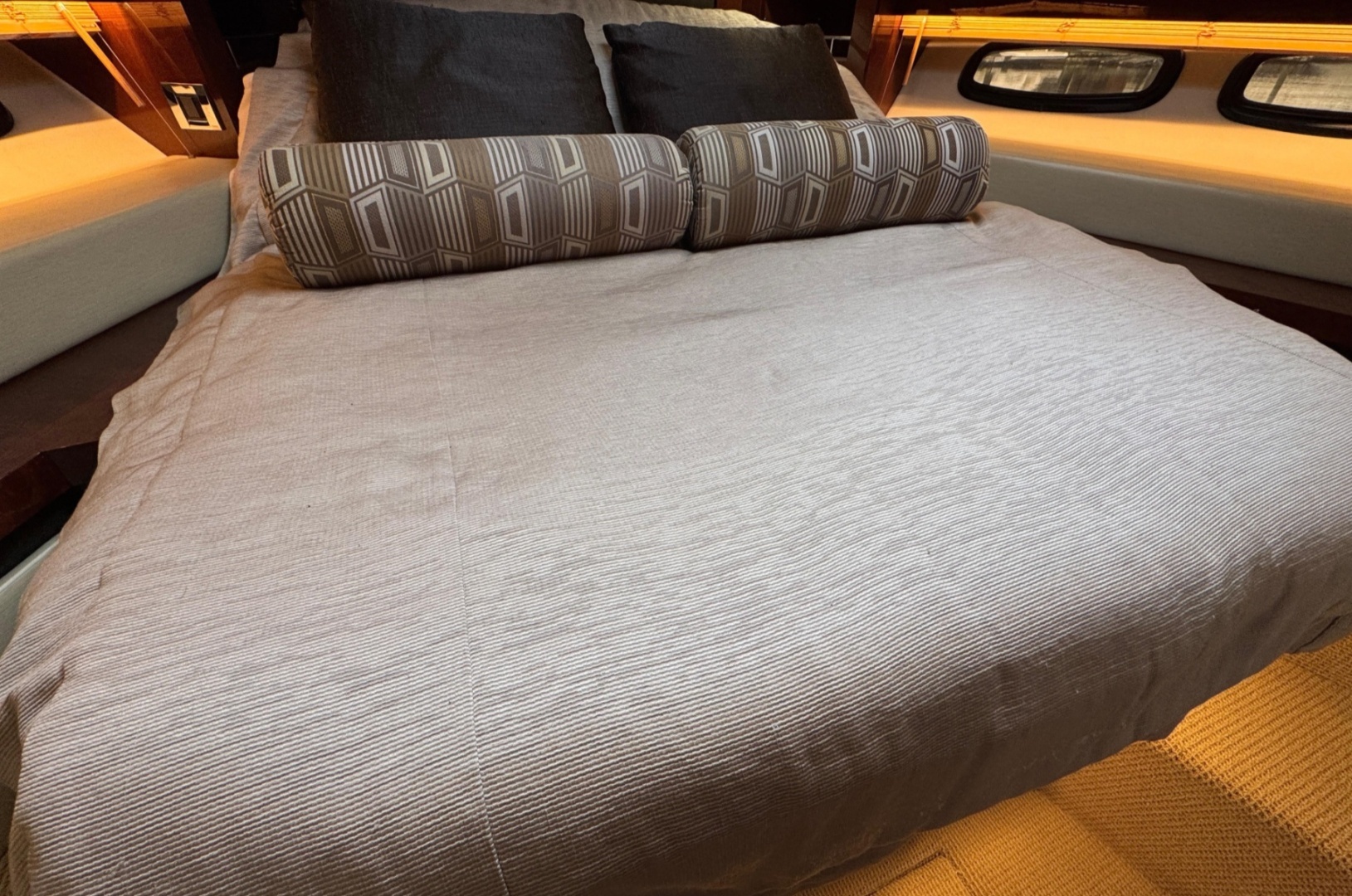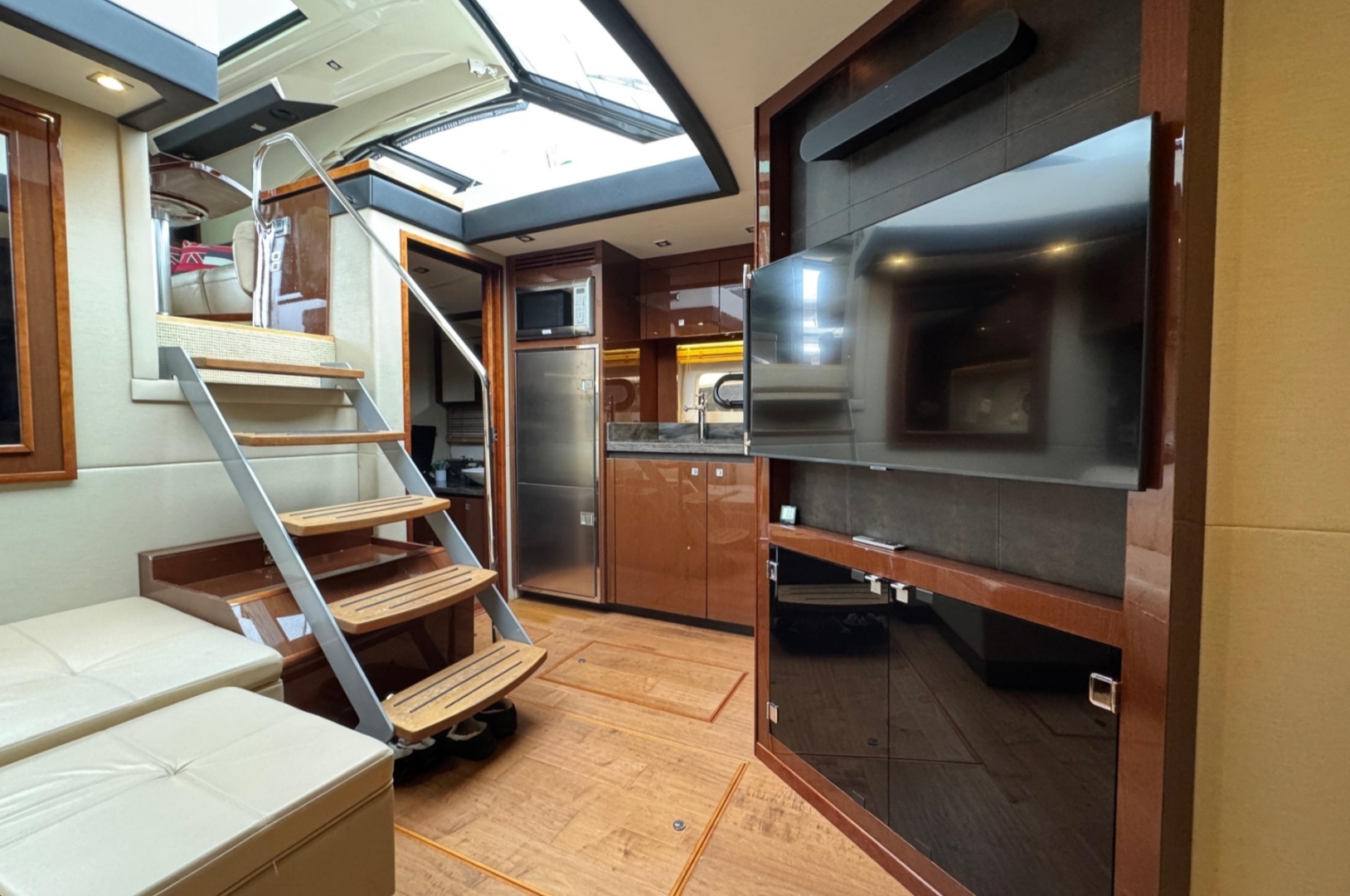 This is the standard two-cabin, two-head layout, which in my view is the right one. Forward island berth, large aft master, good separation between cabins, and a lower salon and galley that feels open instead of buried. Up top is where this boat really earns its keep, with a protected social space that works far better on the West Coast than an open express cockpit that only works on perfect days.