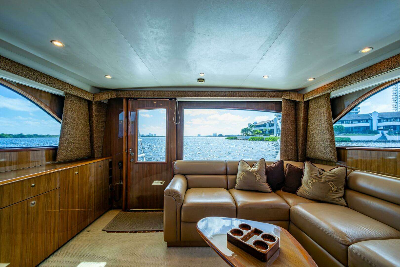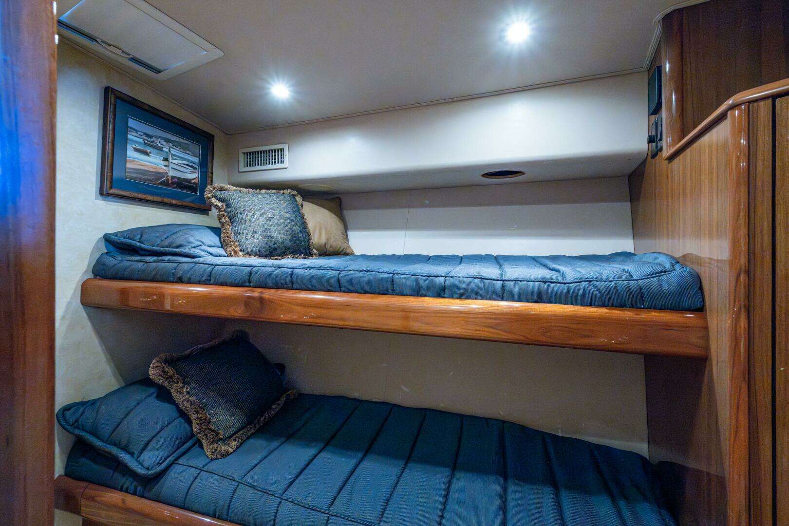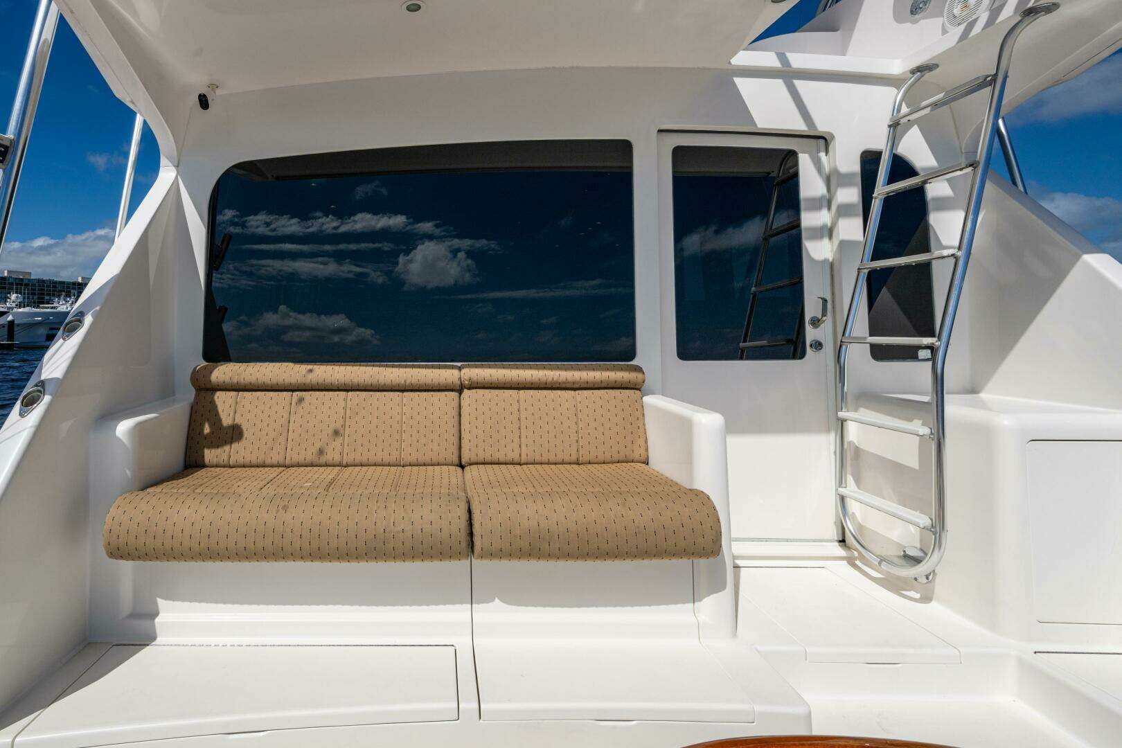 Her cockpit is outfitted with mezzanine seating, providing the ideal vantage point to relax or watch the action in the cockpit. Inside, you'll find the classic Viking interior - rich teak cabinetry, a spacious salon with open galley, and a three stateroom two head layout that offers plenty of comfort for extended trips.