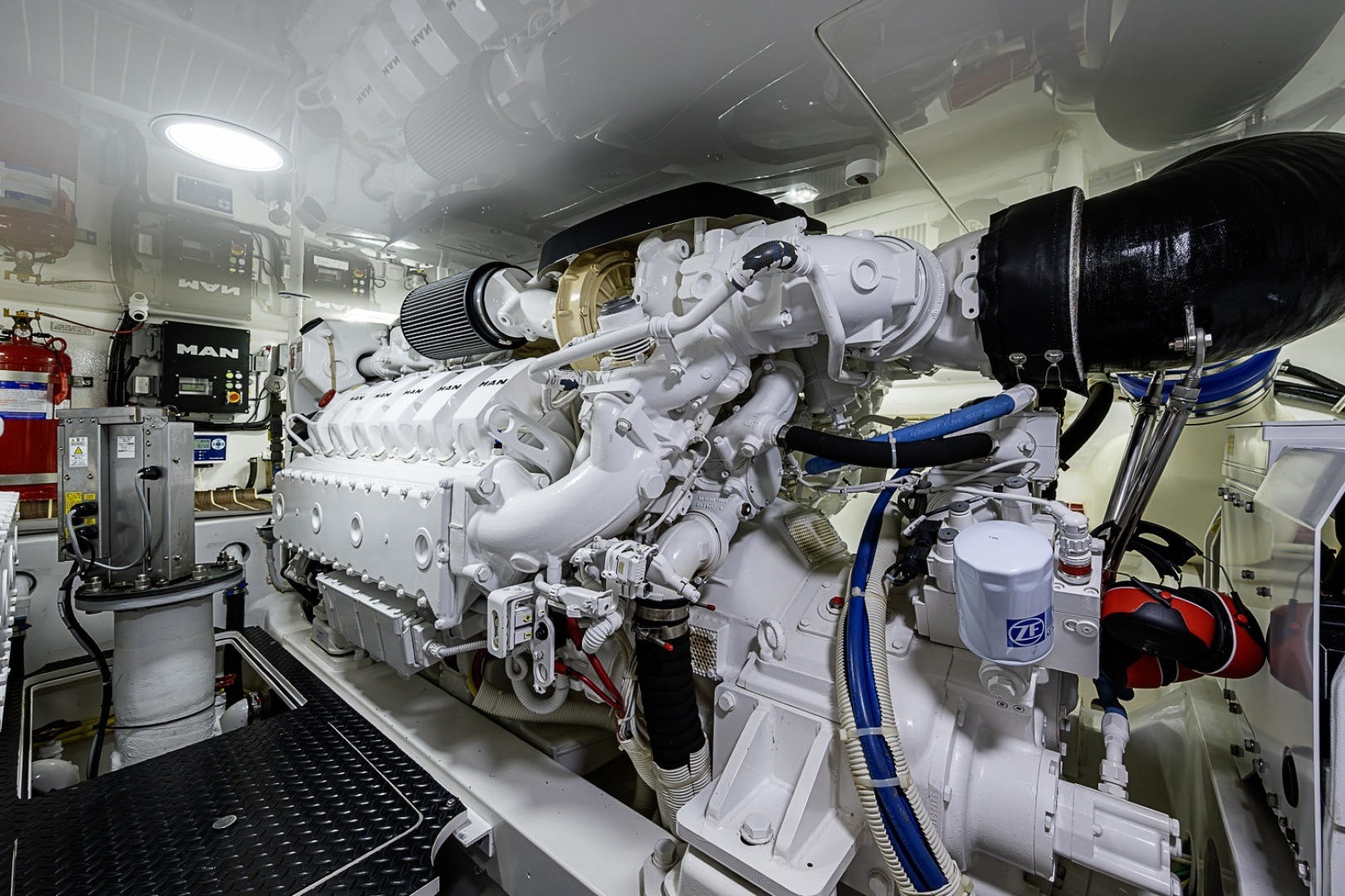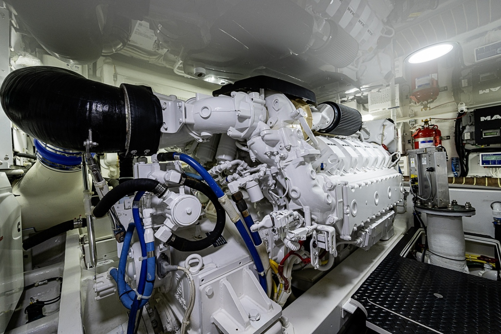 - Fire suppression system, automatically or manually operated and tied into main engine and generator ignition systems with override