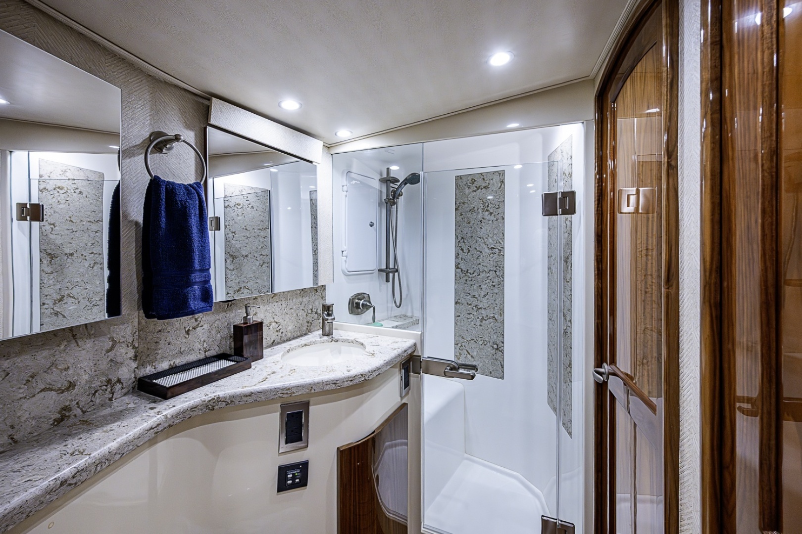 - Storage cabinets in upper galley, high gloss walnut doors with deep, pullout drawers with aircraft style slides for smooth movement and latches to keep drawers in place while underway