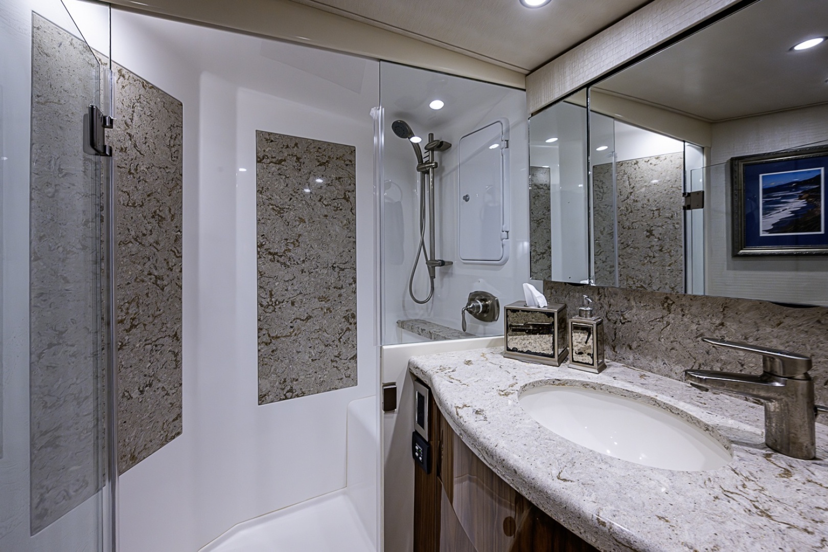 - Fixed, frameless side windows with tinted, tempered glass for style, natural lighting, and privacy