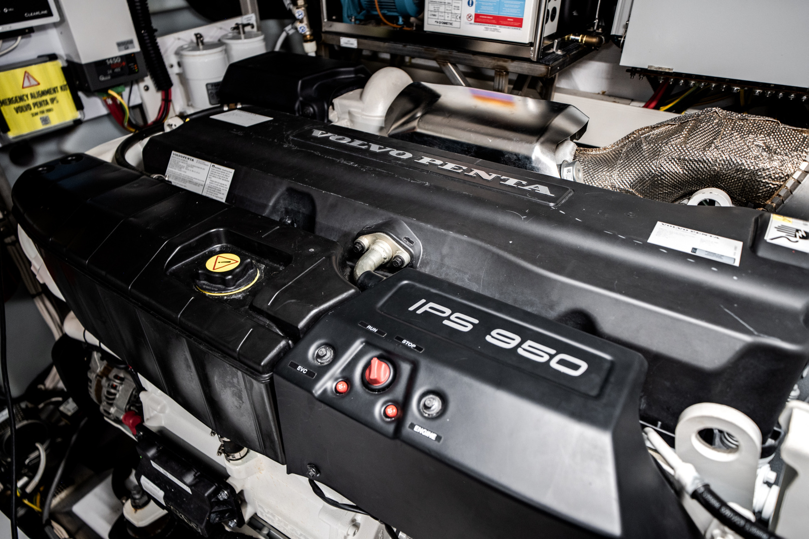 Powered by twin Volvo Penta IPS 950 engines, she offers smooth, efficient performance with joystick control for easy maneuvering.