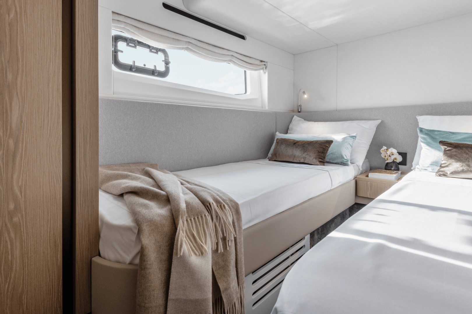 - Spacious accommodation layout with 3 guest cabins plus a crew cabin and 2 guest heads (plus crew head), including a full-beam master suite boasting walkaround space and premium storage.