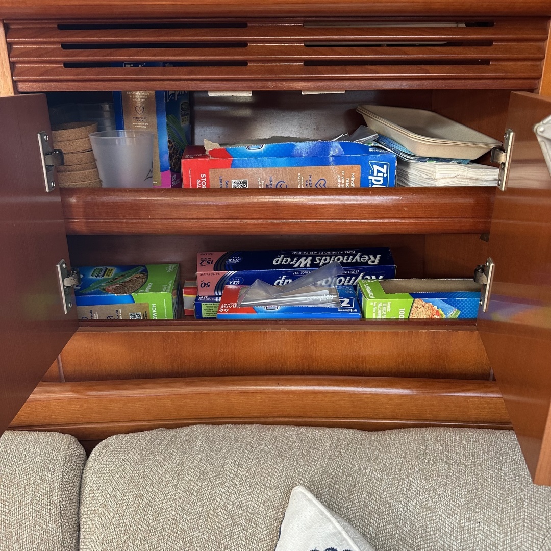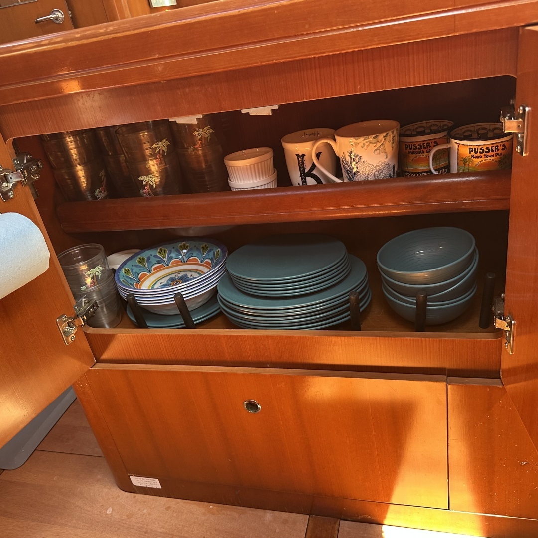 This Beneteau Oceanis 523 accommodates 6 guests within 3 double cabins, as well as a further forward crew cabin. The master cabin is found forward and features a large central double berth, seating area, storage wardrobes and an ensuite bathroom with separate shower area. Two double guest cabins are found aft each with a large double berth and ensuite bathroom. The cabins all have storage under the beds. There is more storage space on this boat than normal. A large U-shaped storage settee with beautiful glossy wood dining table on a stainless steel base to port. The dinette has slip covers that are easy to remove and wash. A straight settee on the starboard side. Aft to port is a large storage cabinet with ice maker. Full beam salon with forward facing nav station to starboard. Galley is to starboard aft with large storage pantry and self unit. Corian countertops in galley with acres of workspace.