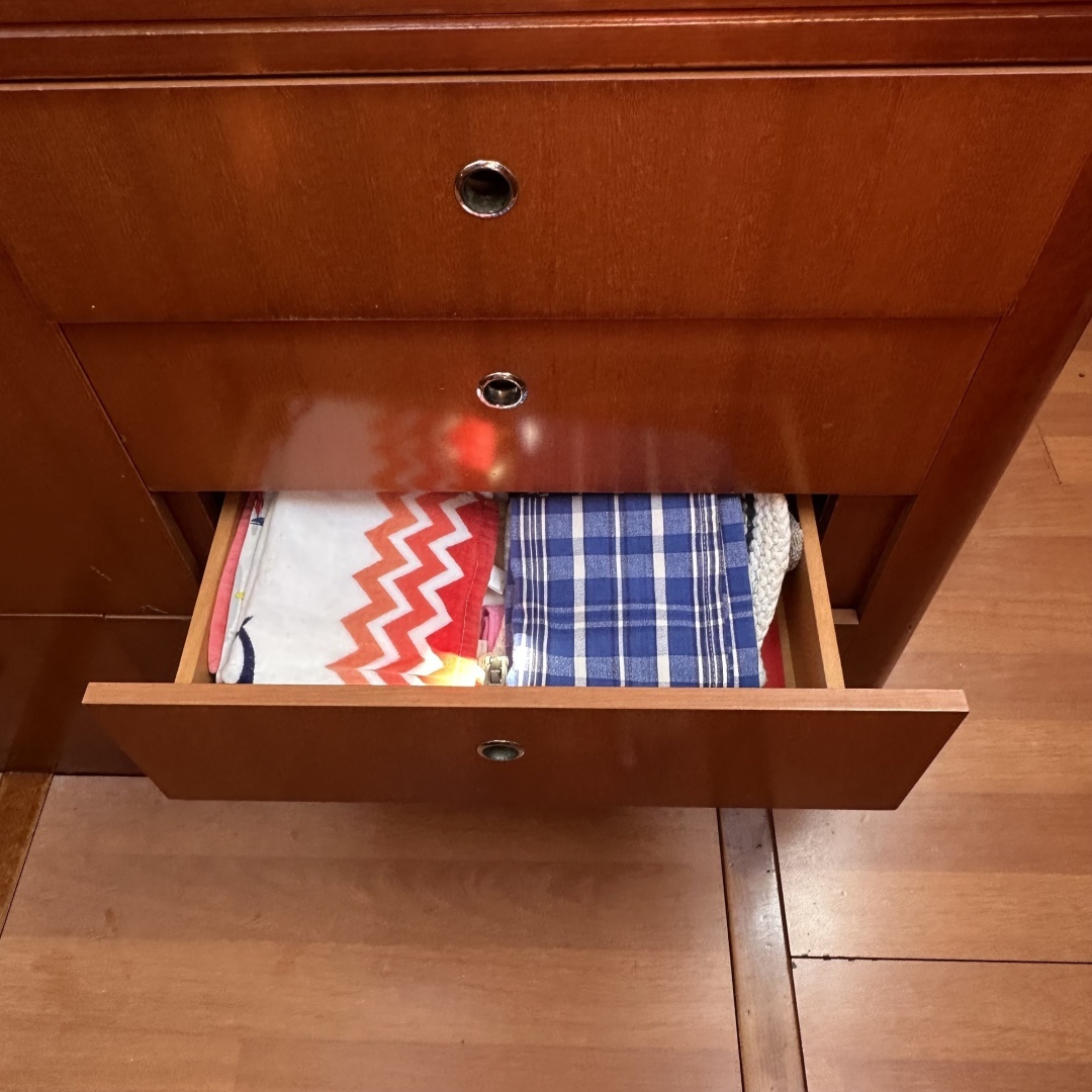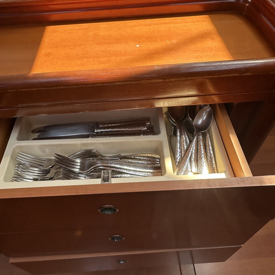 The crew cabin is located at the forepeak, with direct access from the bow. It provides a private V-berth and head. Owners use that space as a “garage with shelves.