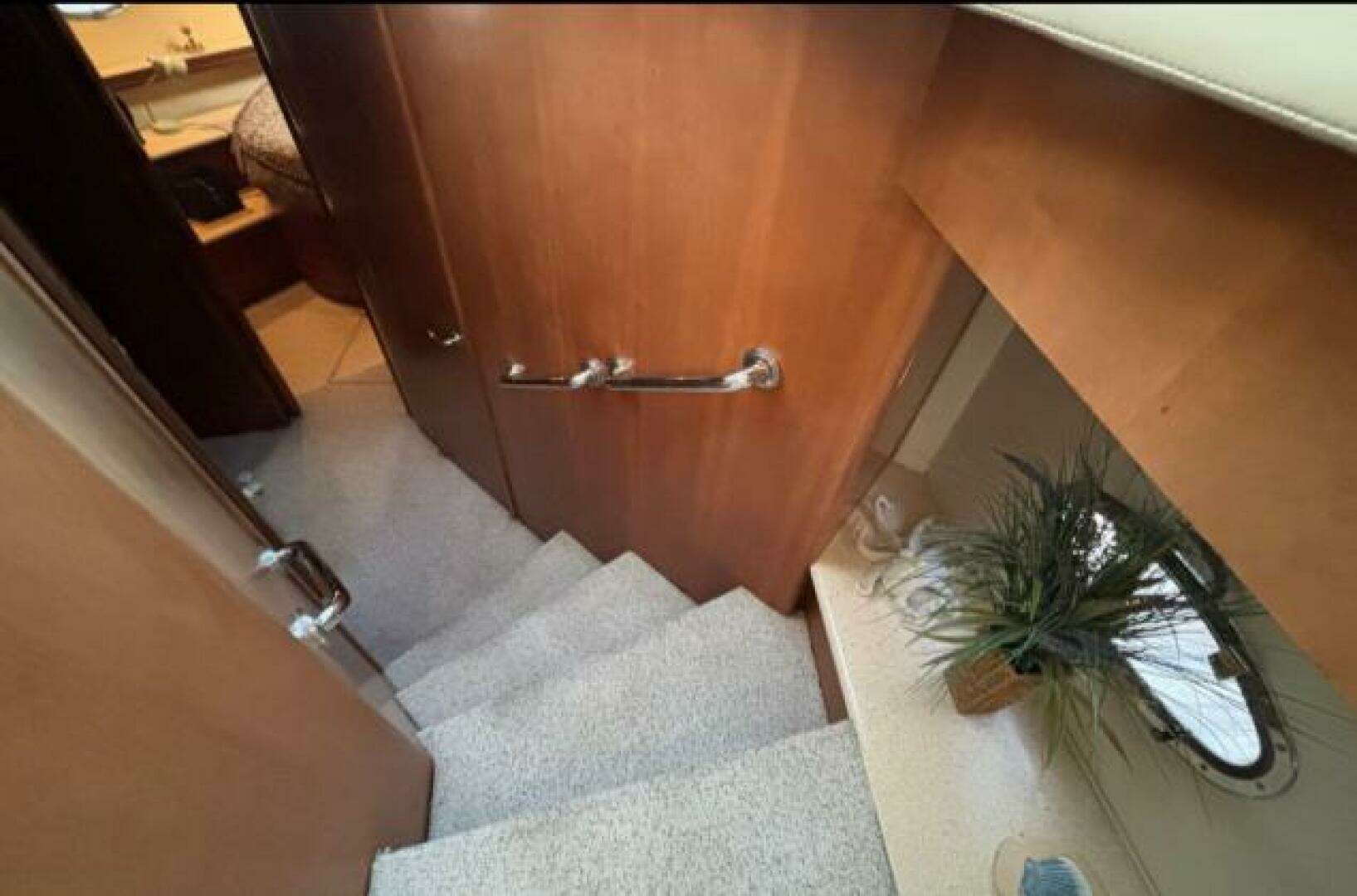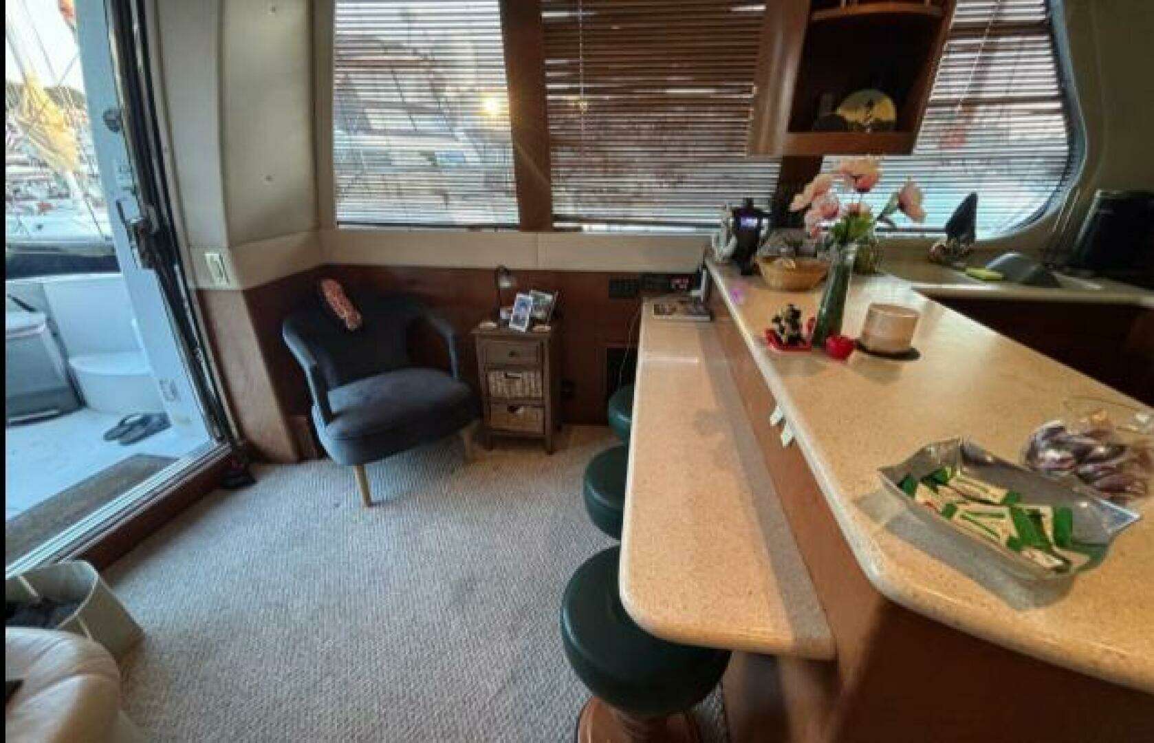 Large sliding glass doors lead from the cockpit to the luxurious cabin where frameless windows enhance light and visibility. A companionway and door lead from pilothouse to bridge, and there's a starboard side deck access door.