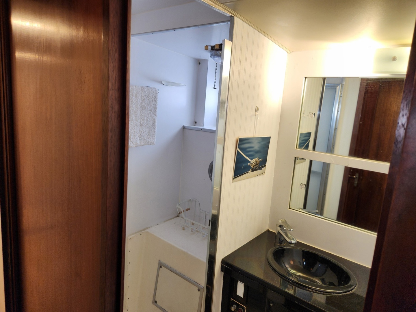 Forward of the galley is the v-berth with two bunks stbd side, each with reading lamps. Two speakers, two porthole windows and a large overhead hatch. Large counter space with two drawers and bottom cabinet. The windlass chain locker is forward and houses 300 ft of anchor rode (200 ft of 3/8 chain + 100 ft of twisted rope). Located aft is the head with a Galley Maid toilet, countertop with sink, cabinet space below and a shower stall. Directly across to the stbd side is the Frigidaire stacked washer/dryer and closet.