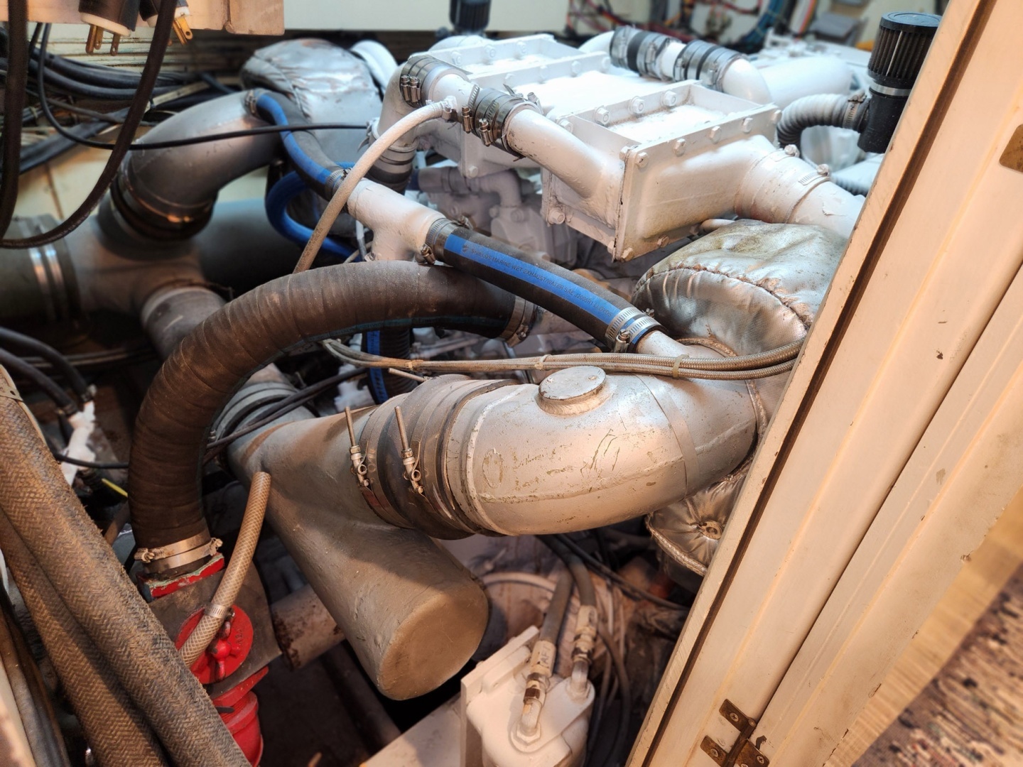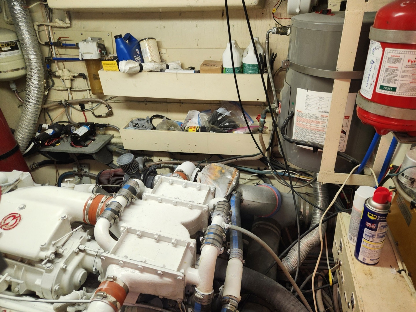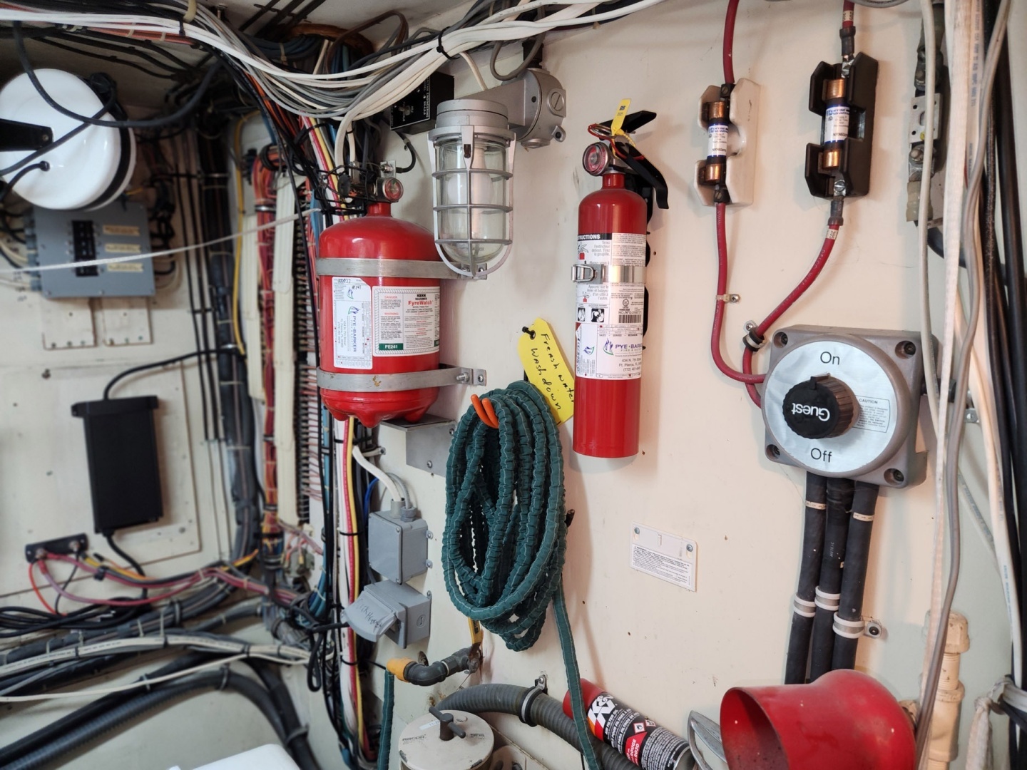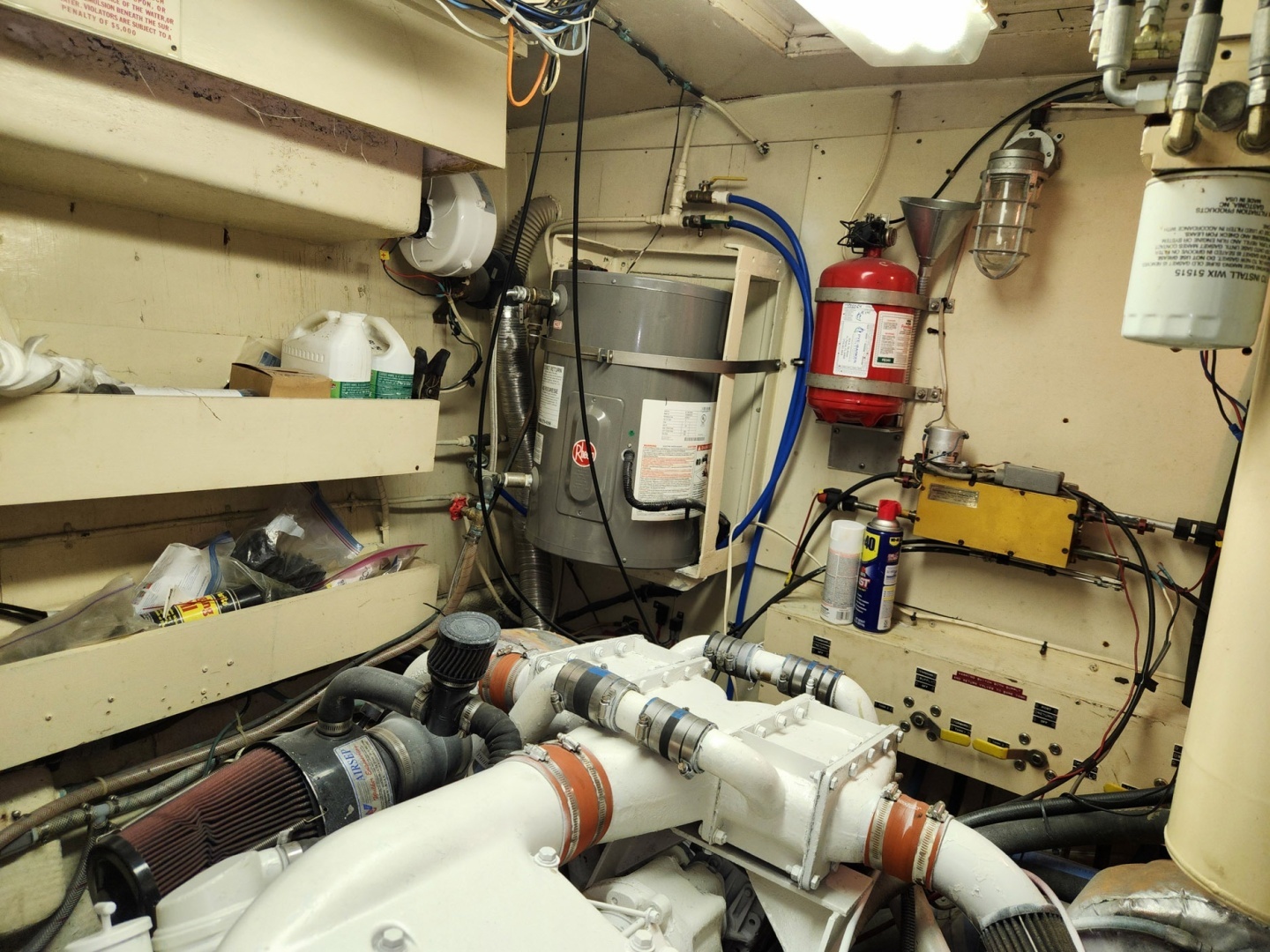 Moving aft of the galley are the two engine rooms. Port side includes the Detroit Diesel 8v71TI engine, Kidde carbon monoxide alarm, Kidde Mariner Fyre Watch suppression system, Sentry battery charger, four Cruisair reverse cycle a/c units. Starboard engine room has the Detroit Diesel 8v71TI engine, fire extinguisher, ProSafe FS60 FailSafe Galvanic Isolator, Groco pressure storage tank, Jabsco wash down, Pentair Shuffle Aqua King II, Rheem hot water heater, and Naiad stabilizer system.