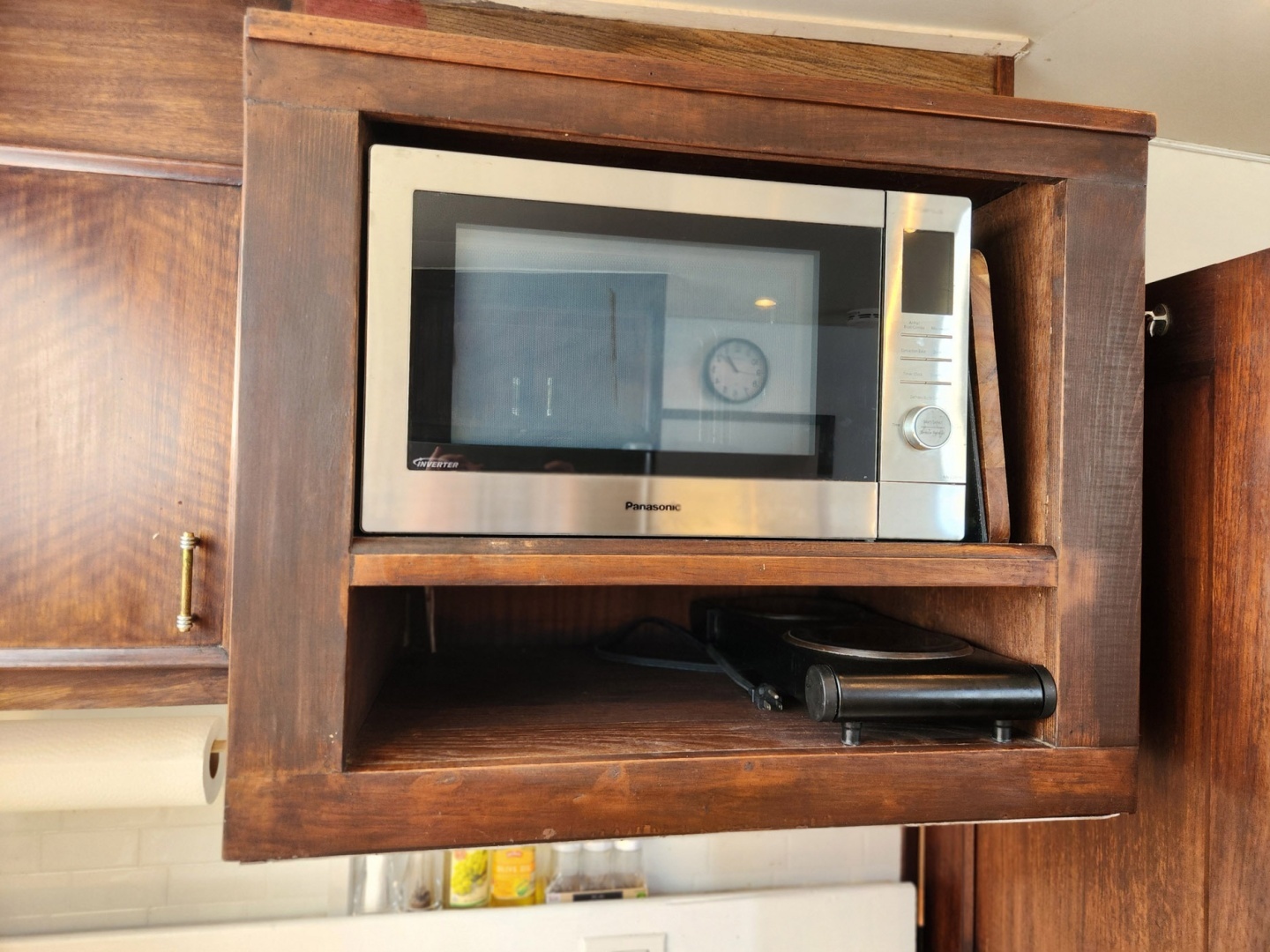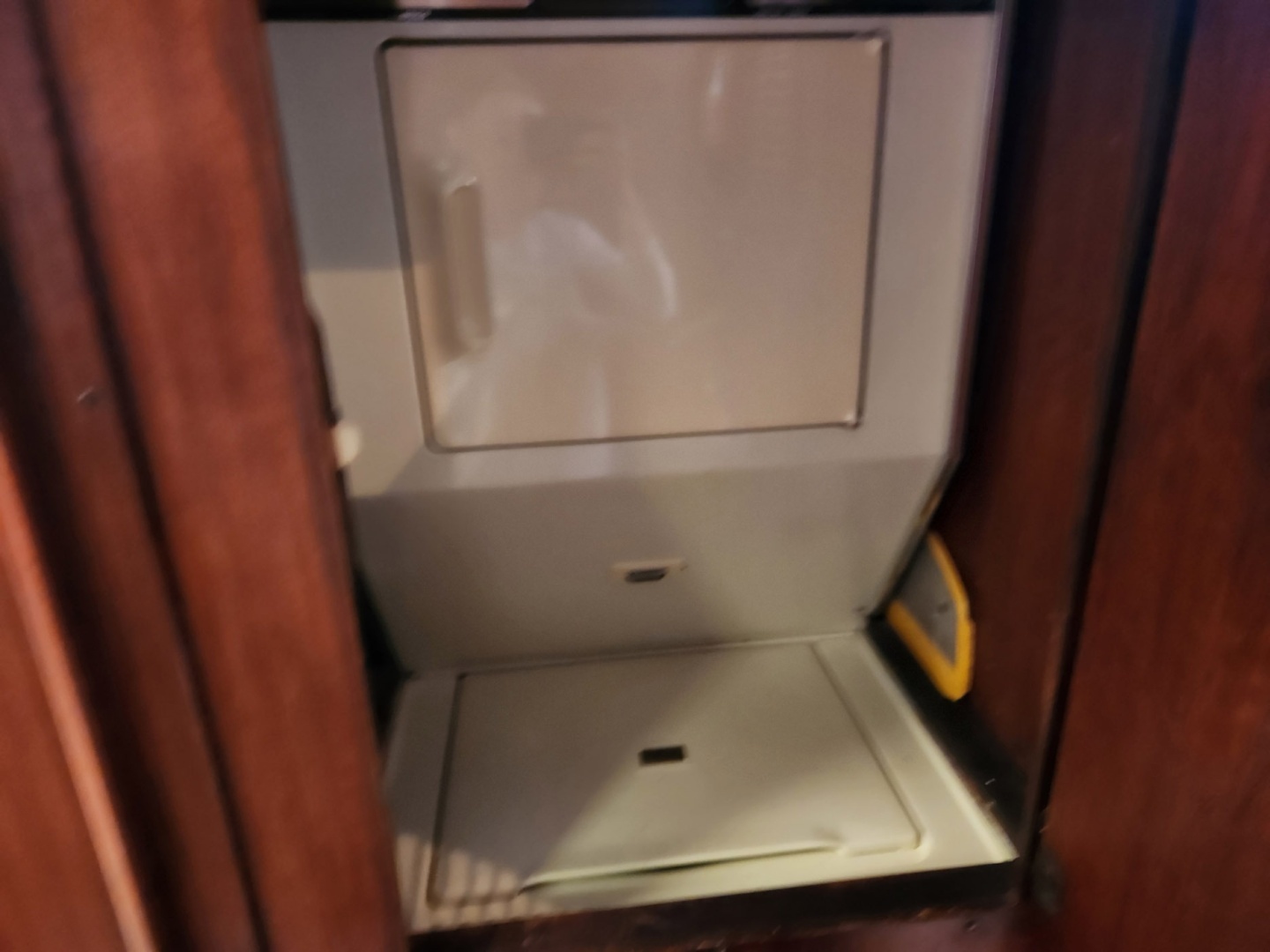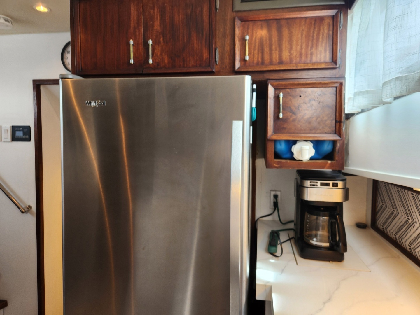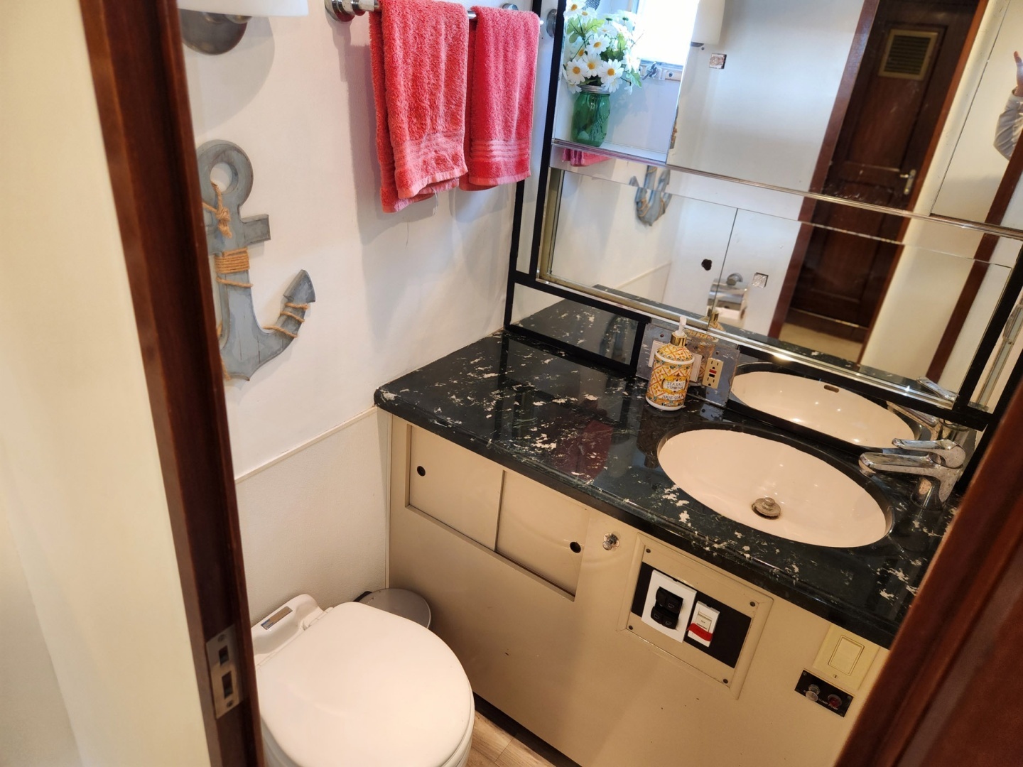 Down several steps on the stbd side and you will enter the galley and dinette area with slider cabinet space and drawers below the seating. Port side has the updated galley with the new L-shaped Corian countertop with a s/s sink and faucet. The overhead cabinet houses the Panasonic convection/ microwave/ air fryer, and Cuisinart two burner 110v countertop cooktop. Below are three large storage drawers for pots/pans and additional drawers and cabinet space for all your cooking essentials. Aft facing is the full-size Whirlpool refrigerator with bottom freezer drawer. The galley flooring has been updated with faux vinyl flooring. There is another independent a/c unit in the galley. The generator room is located under the galley floor which comprises a Cummins Onan 10kW 2x 32v engine battery banks, 24v windlass and bow thruster battery system, 24v AGM (Rolls Surette) house batteries, 3500W Magnum Inverter/ Charger and the Victron SmartSolar charge controller (MPPT 100/50).