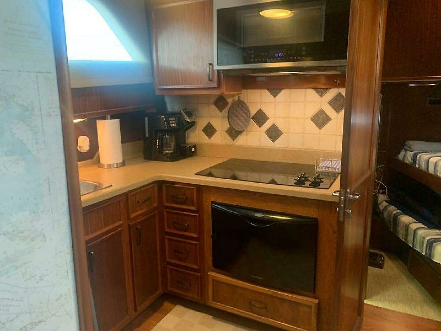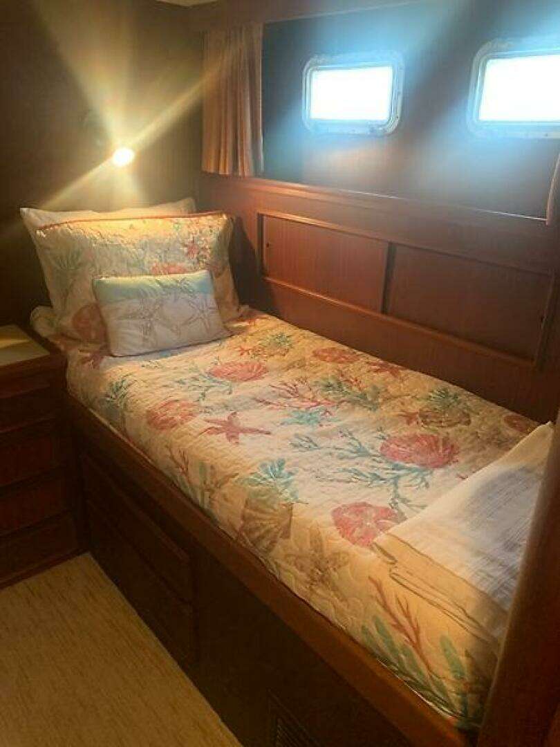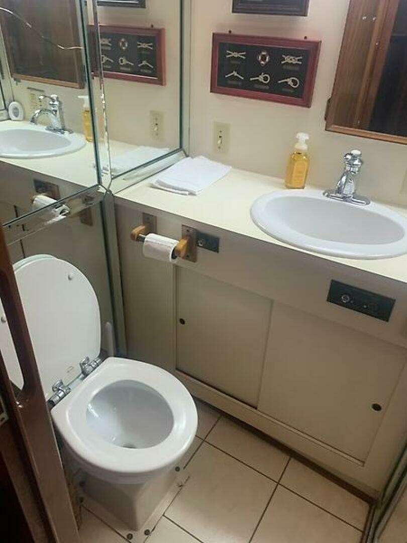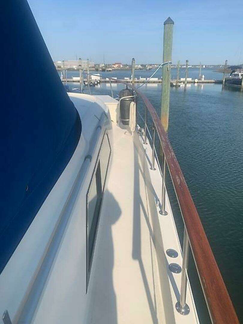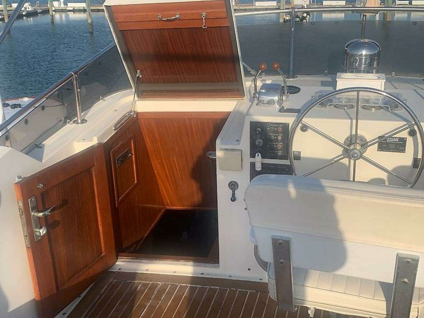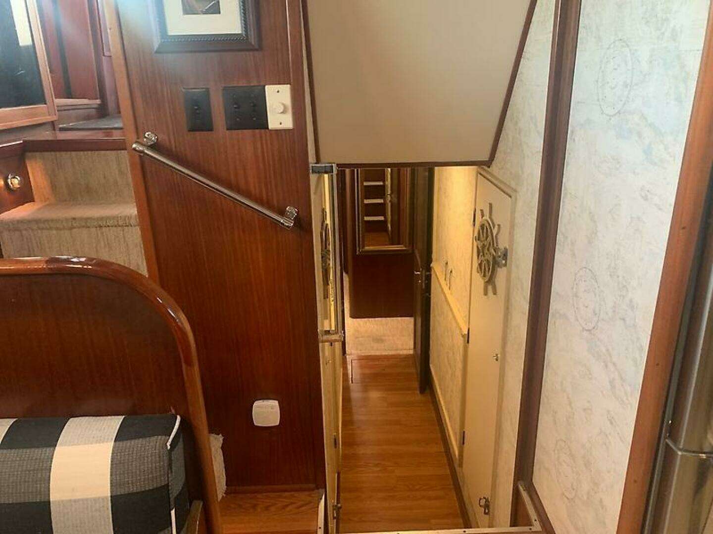This model offers a desirable 3‑stateroom, 3‑head layout, along with separate engine rooms that provide both forward and aft access—an uncommon and highly valued design choice for maintenance and serviceability. Additional highlights include a pass‑through galley, molded foredeck seating, bow pulpit, and port and starboard wheelhouse doors for excellent deck access.