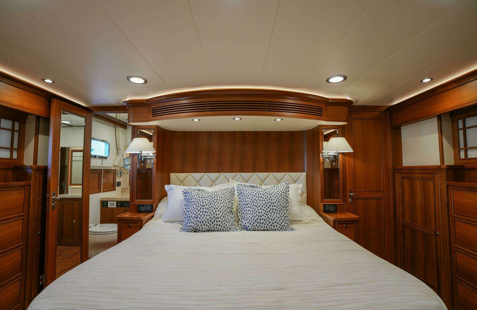 The full-beam master stateroom is a spacious and serene retreat, centered around a midship king-size berth with built-in nightstands on either side and additional storage drawers beneath. To starboard, the en-suite head offers convenience and privacy, thoughtfully integrated into the stateroom’s layout.