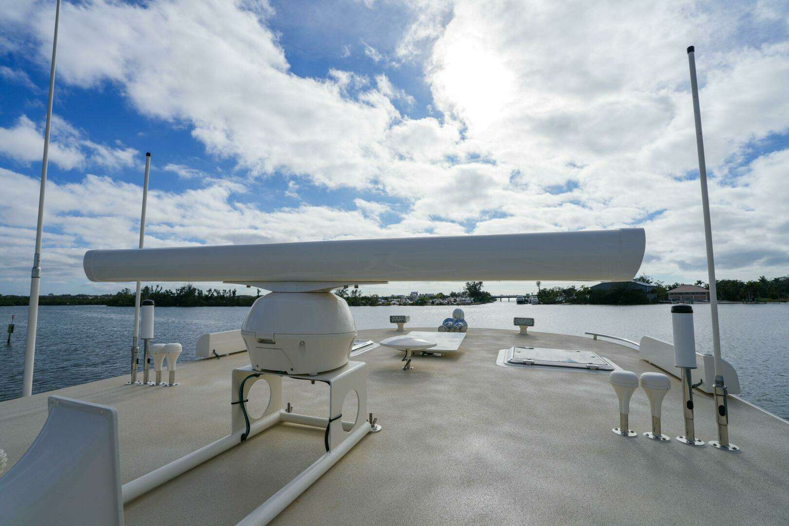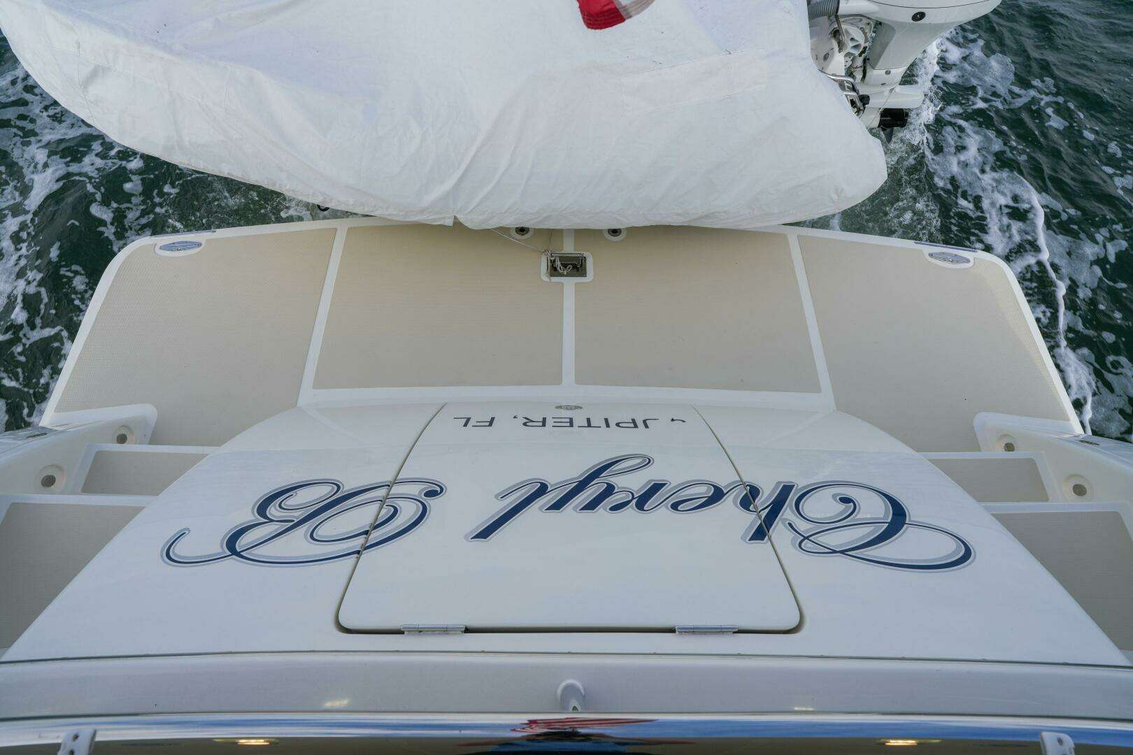 Continuing aft, the deck is outfitted with a telescoping davit for easy tender handling, along with a spacious dock box that provides excellent additional storage. The entire area is protected by a custom-made canvas top, elegantly supported by removable carbon fiber posts, ensuring shade and comfort while preserving the yacht’s sleek aesthetic.