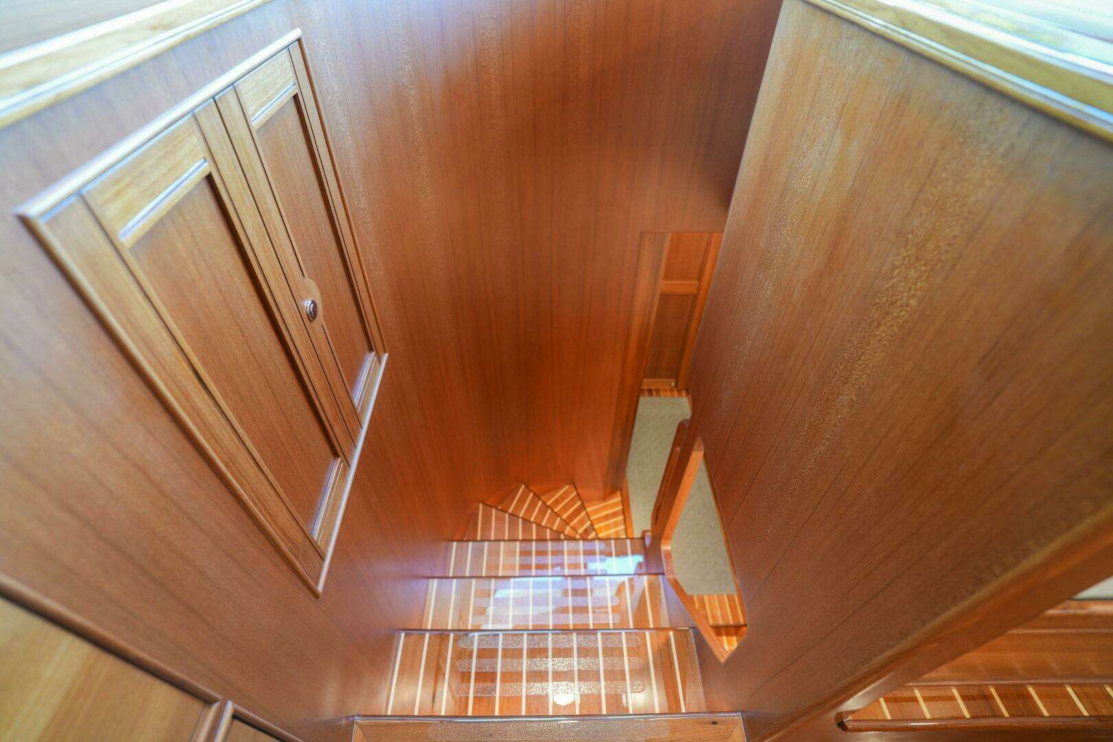At the foot of the stairs, the layout unfolds with the forward VIP stateroom, a guest stateroom to starboard, and the full-beam master suite aft. The master features an en-suite head to starboard and direct access to the engine room through a watertight bulkhead, ensuring both convenience and safety. The VIP and port guest staterooms share a well-appointed head located along the port side of the companionway.