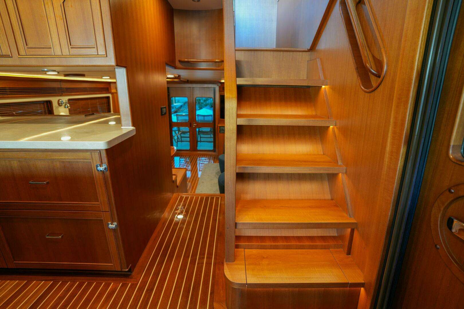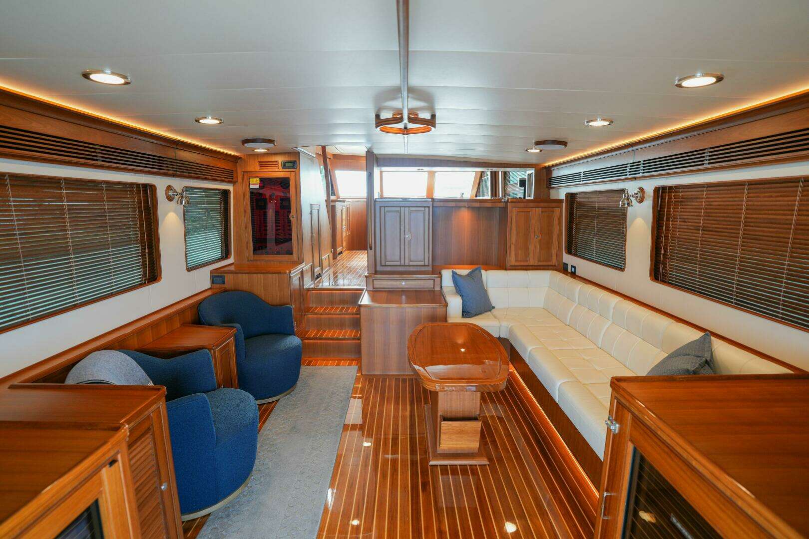 Stepping into the salon from the cockpit through a set of double doors, you immediately appreciate the generous 17’3” beam that gives “Cheryl B” the presence and feel of a much larger yacht. The elegant teak and holly flooring runs the full length of the salon and continues seamlessly throughout the vessel, adding warmth and sophistication to the interior.