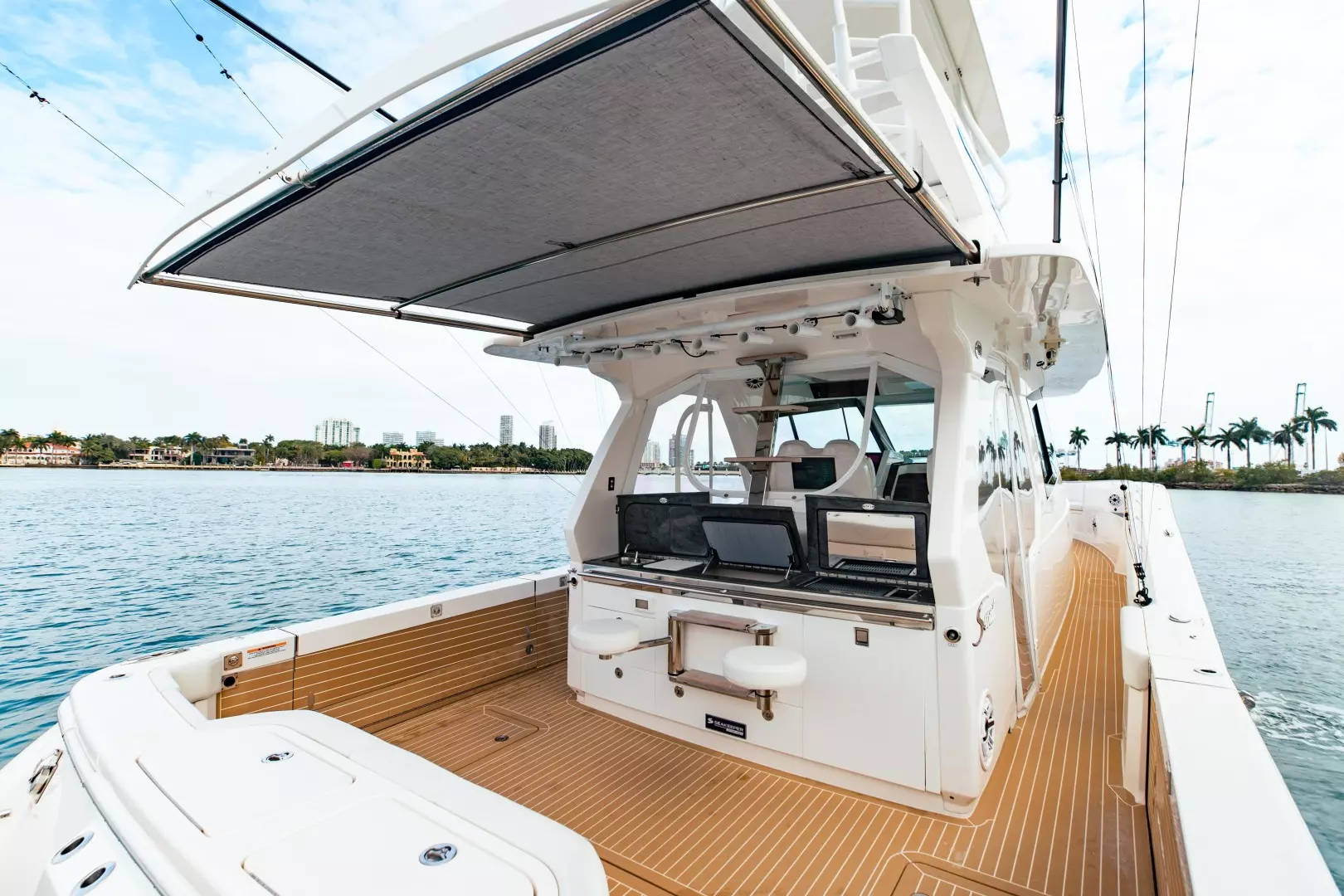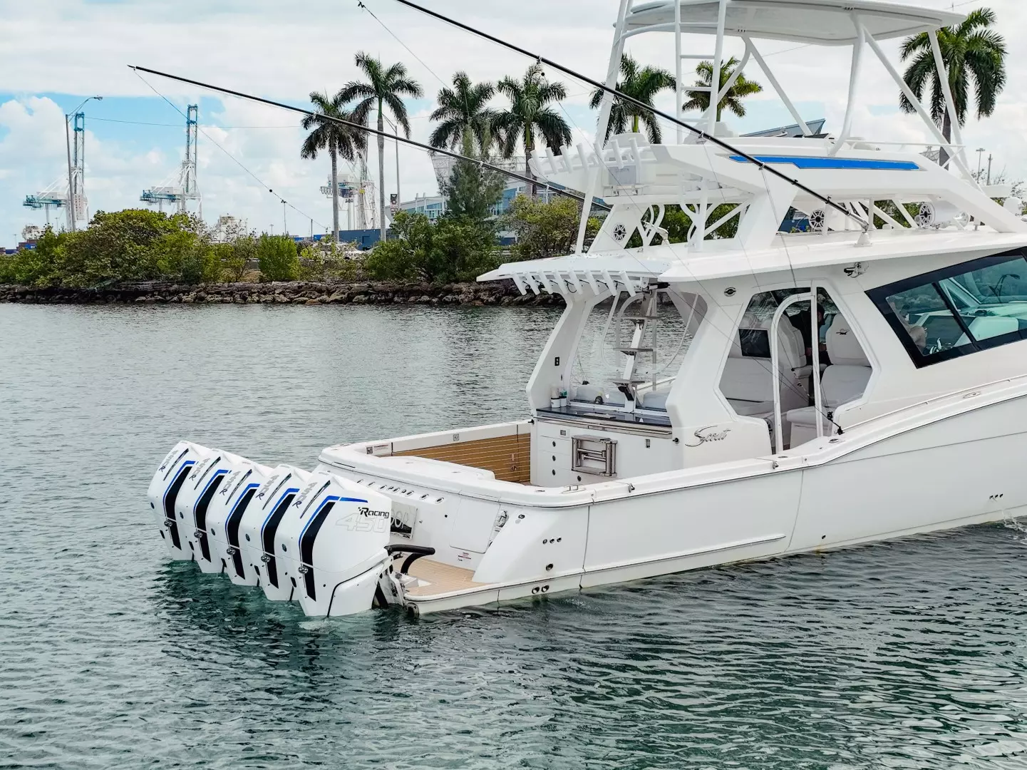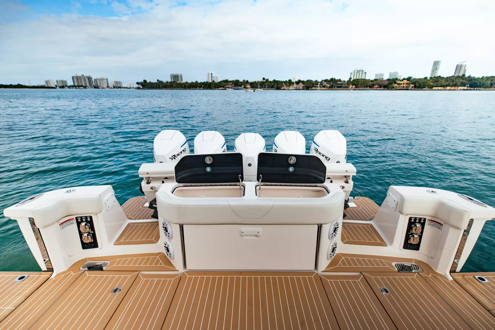 Patent pending. With the touch of a button, you can electronically raise or lower the hardtop mounted rocket launchers. When the SureShade retractable awning is deployed, the rocket launchers will also lower electronically. Having the rocket launchers articulate not only provides an added unique feature to the boat, but also helps with ease of loading/unloading rods.