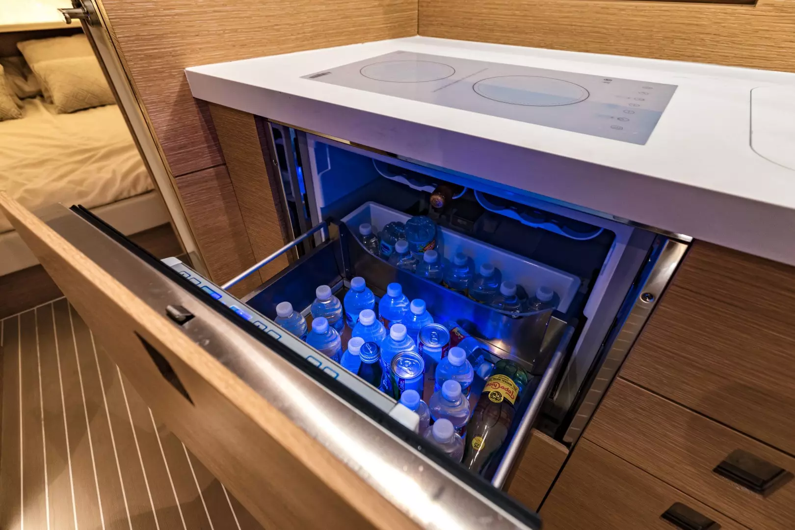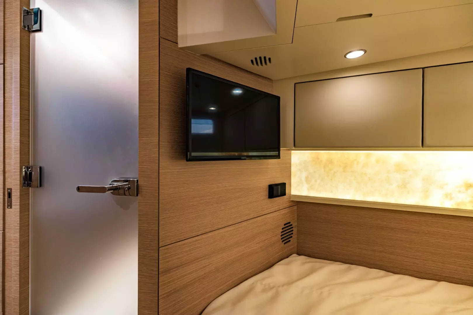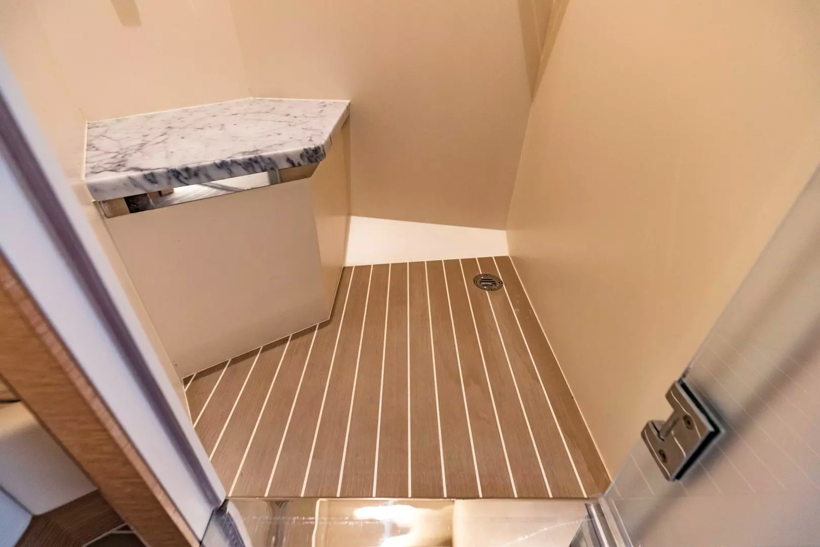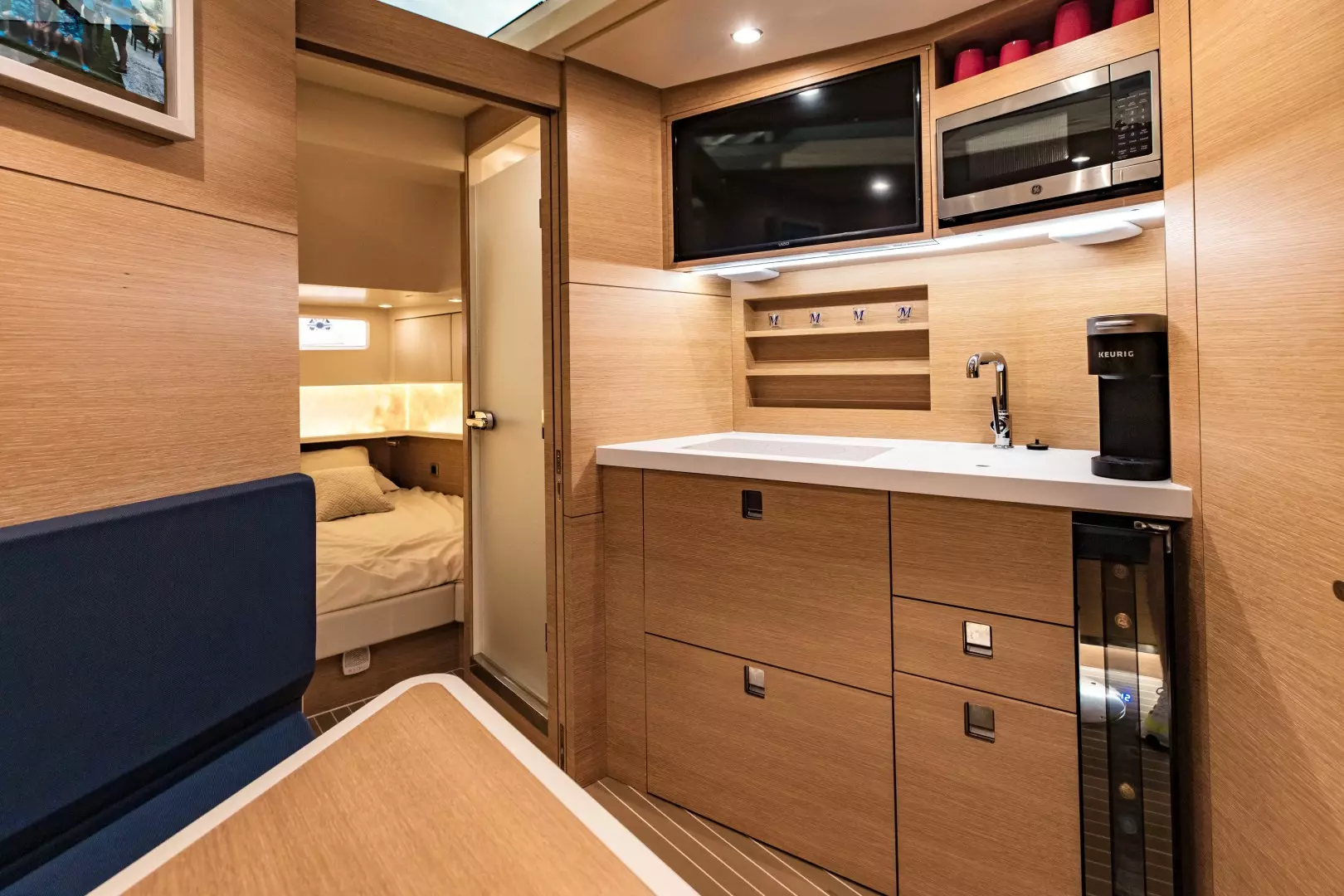 The appointments down below are unmatched in a model this size. You’ll feel like you’re stepping into a private jet, or a luxury home. Private master stateroom, convertible sofa-to-berth, private aft berth, enclosed separate shower, enclosed separate head, galley and hanging closet...and plenty of other hidden storage.