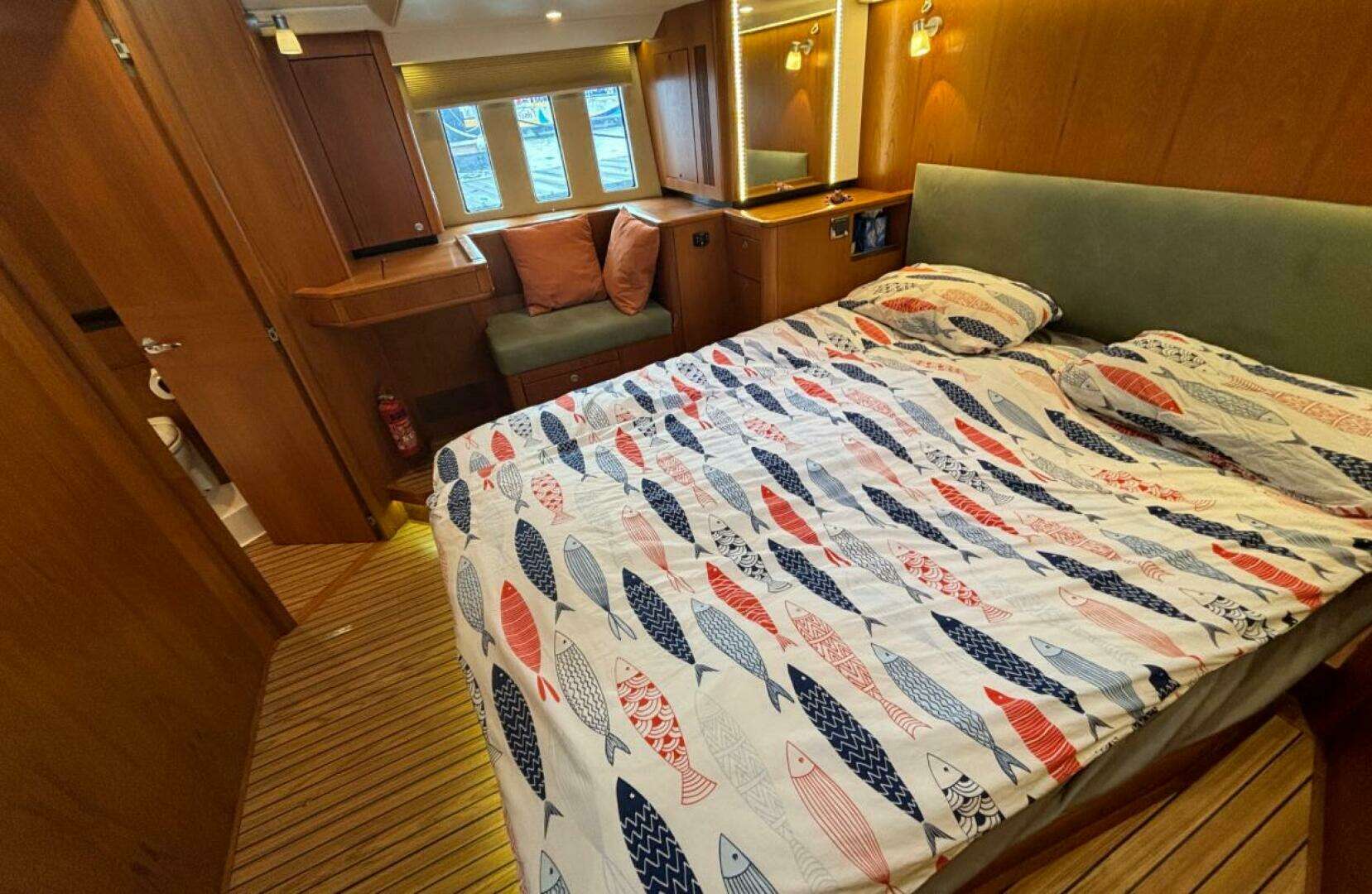 Continuing forward is a large forward guest cabin with island queen berth, direct access to the forward head, and ample stowage.