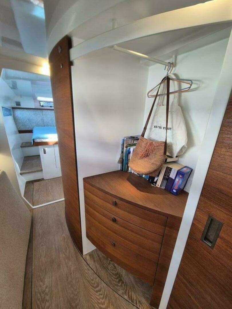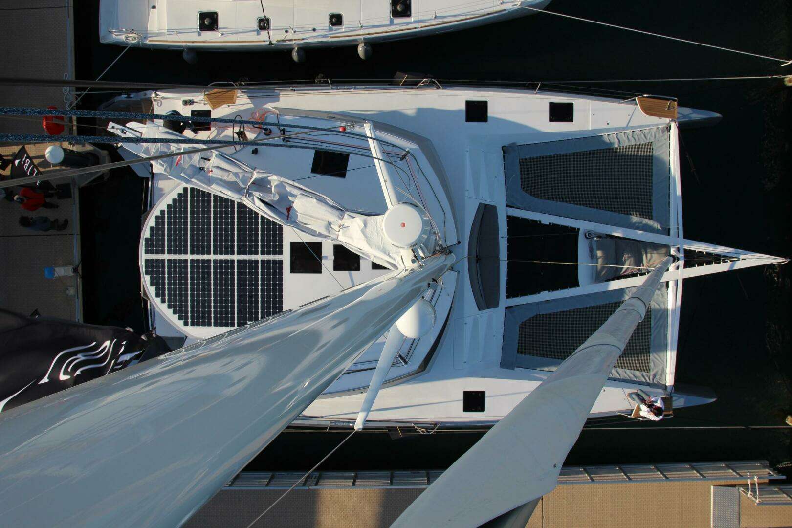 - Carbon fiber composite gangway 260 x 45 cm hidden in cockpit floor (GS Composite foldable, carbon trapeze with ropes, carbon stanchions, storage bag; storage STB stern locker)
