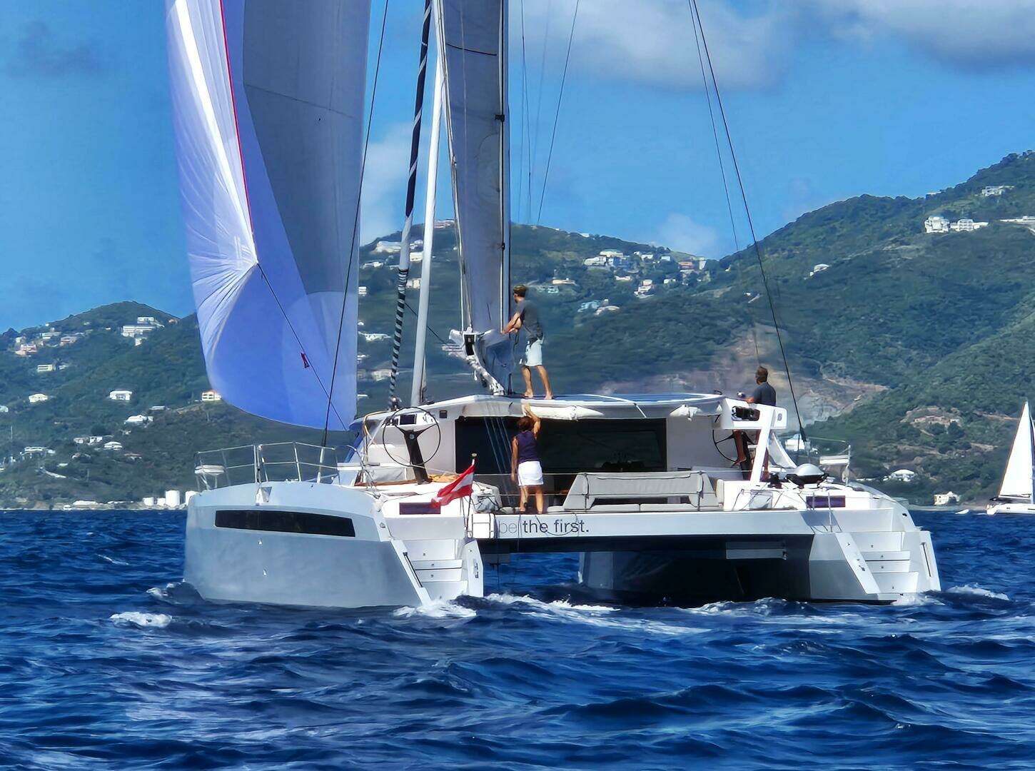 Austria flag & EU VAT paid, BE THE FIRST is currently located in Nanny Cay Marina, Tortola, BVI—Ready for the BVI Spring Regatta and Caribbean Multihull Challenge! A rare opportunity to own a class-defining performance catamaran. Contact us today for more details, many more recent photos or to schedule a showing of this stunning performance catamaran.