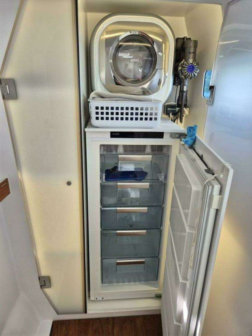 Equally impressive is her self-sufficient cruising capability. A large lithium battery bank and expansive solar array enable generator-free living at anchor, with a generator available if needed. Uncommon amenities for a true performance platform—including air conditioning, watermaker, washing machine, dishwasher, wine fridge, deep freezer, and a dive compressor, all seamlessly integrated throughout.