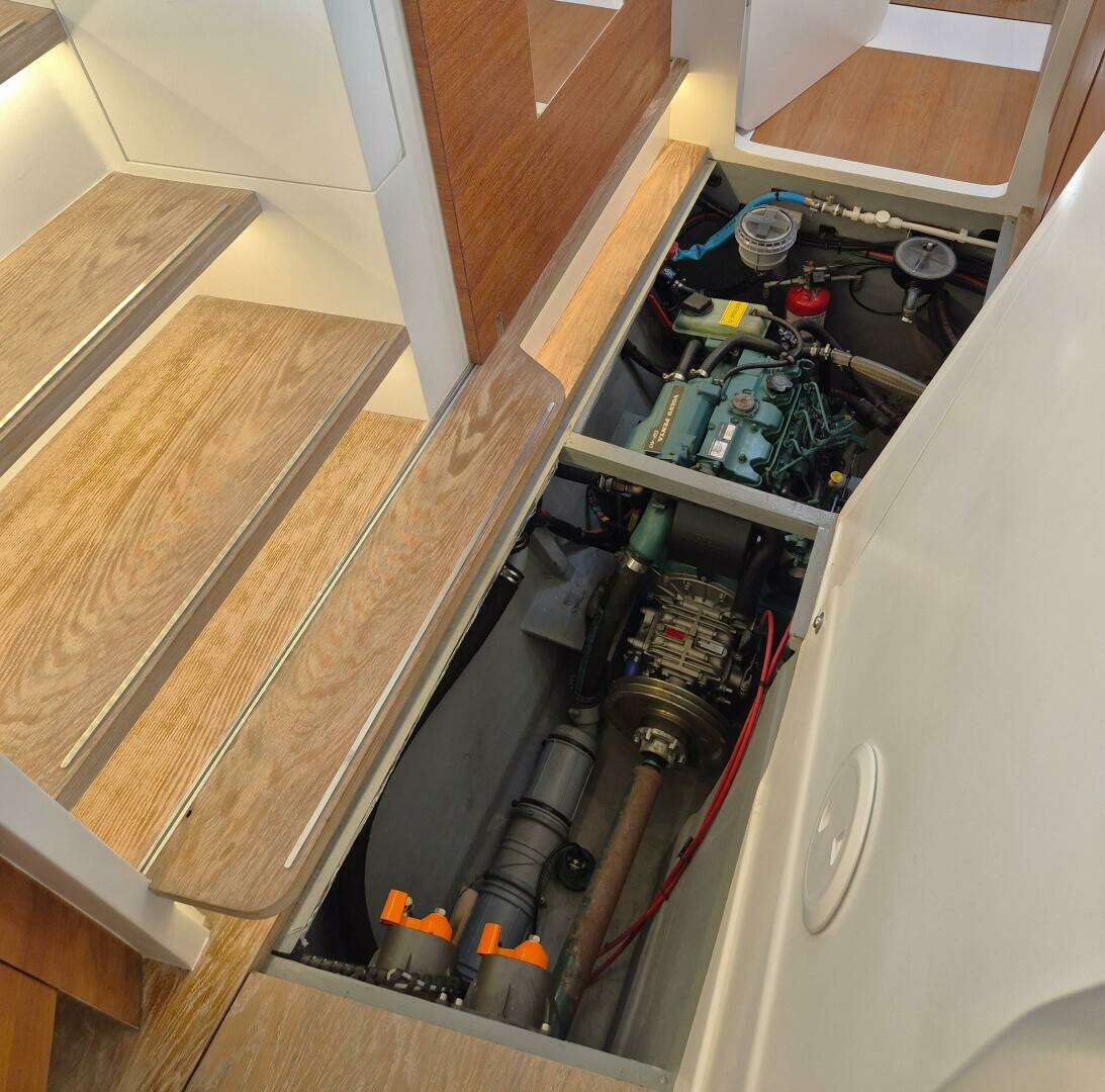 This vessel is equipped with a Retractable Propulsion System (RPS) that eliminates the drag associated with a saildrive and propeller, as well as the distortion of water flow to the rudder, by fully retracting the drive shaft and propeller into the hull while sailing. When deployed, the system allows for a full-size fixed propeller, delivering superior performance under power and excellent maneuverability in tight docking situations.