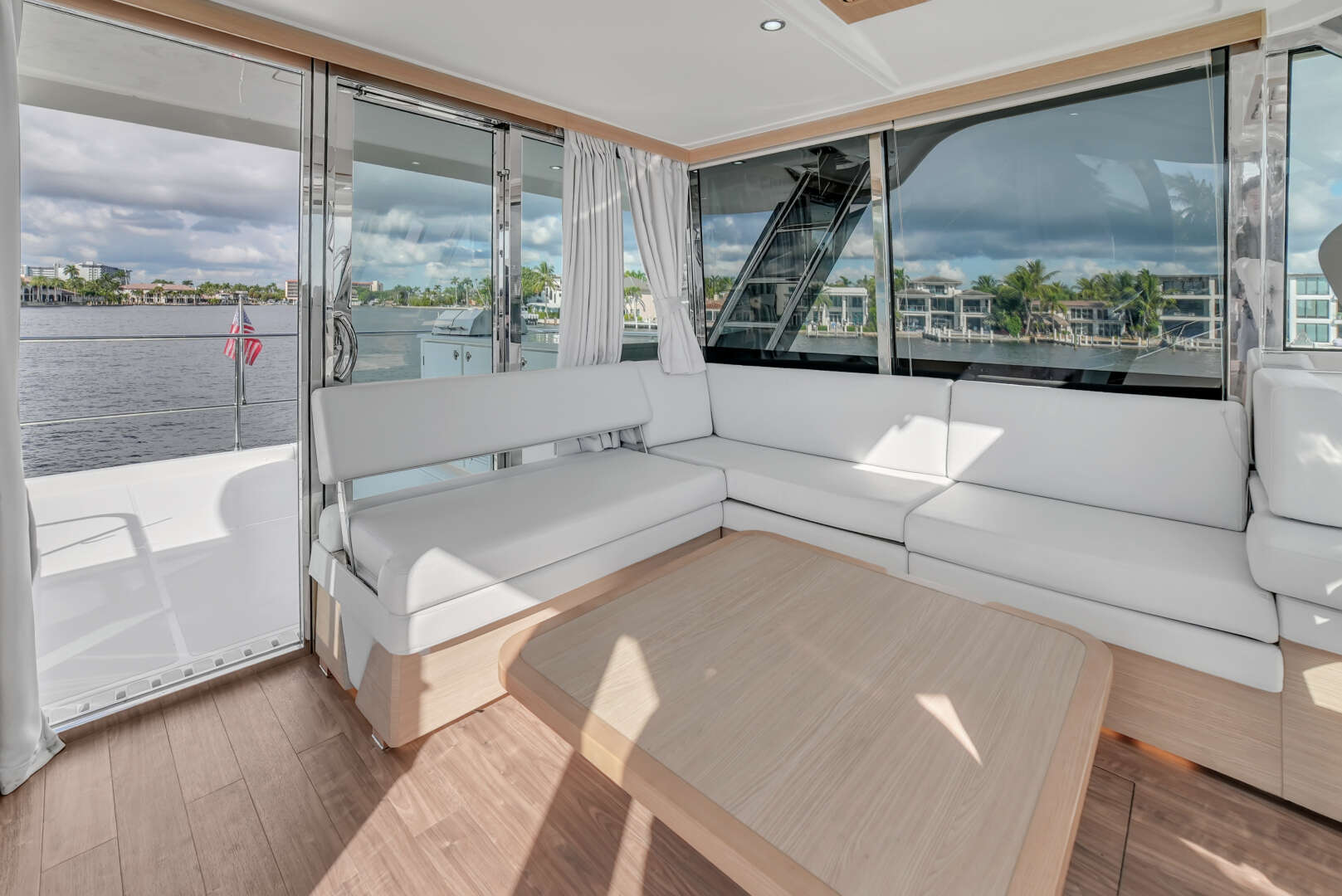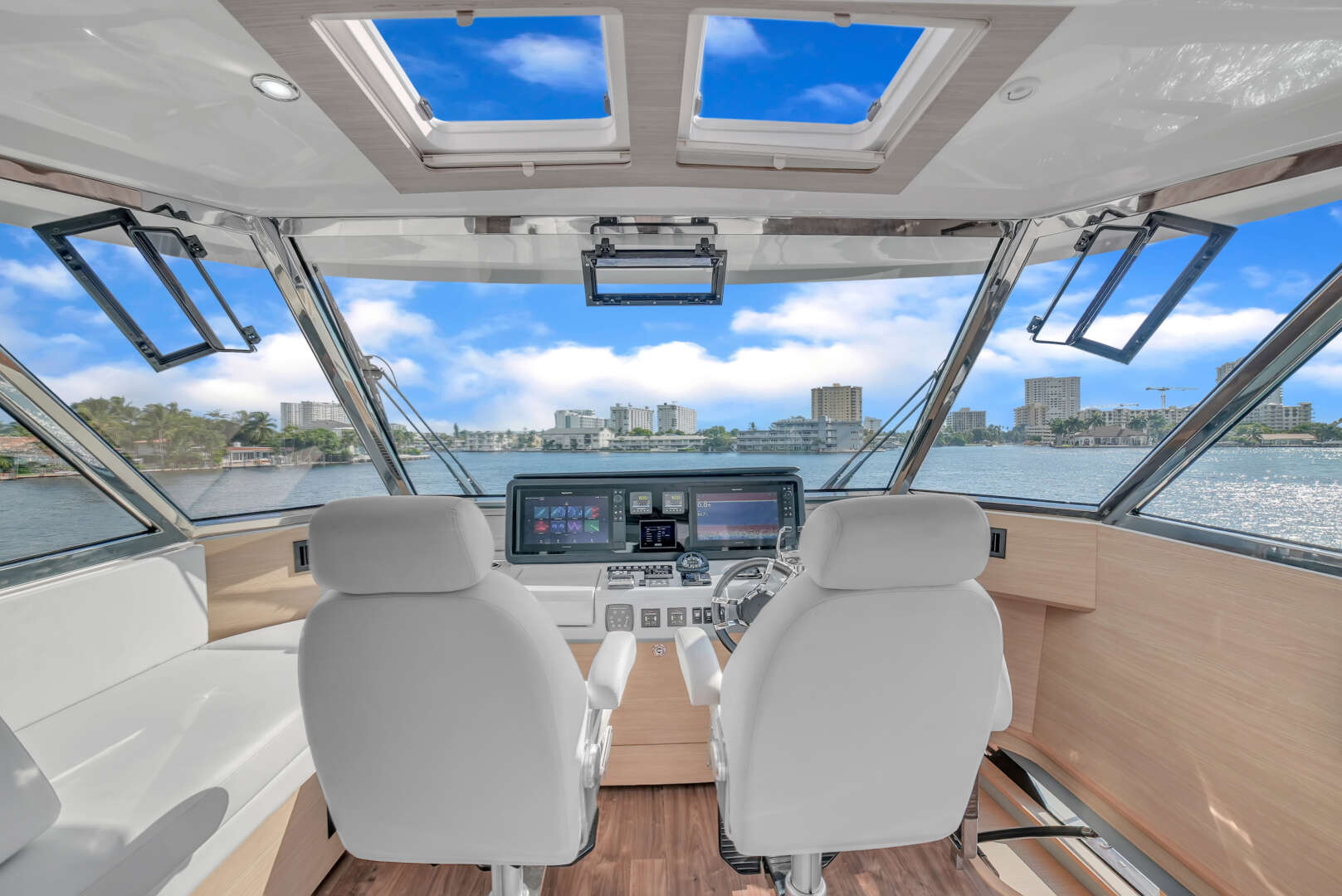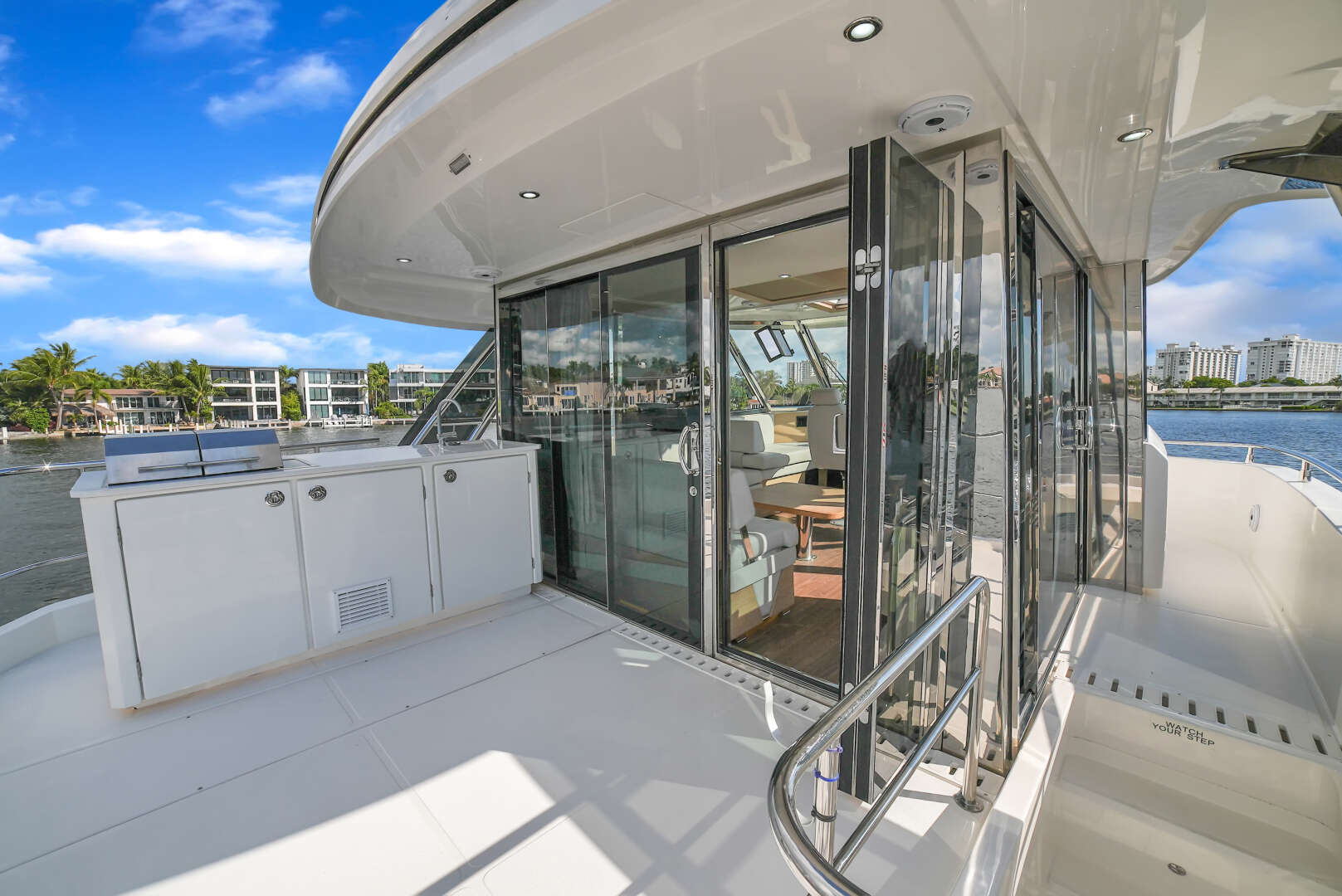 Fully enclosed flybridge Sky Lounge with upgraded furniture, upholstery & fabric to match salon; aft sliding door; side access door with additional access from interior stainless steel stairway in lieu of standard 5 panel tempered glass windscreen