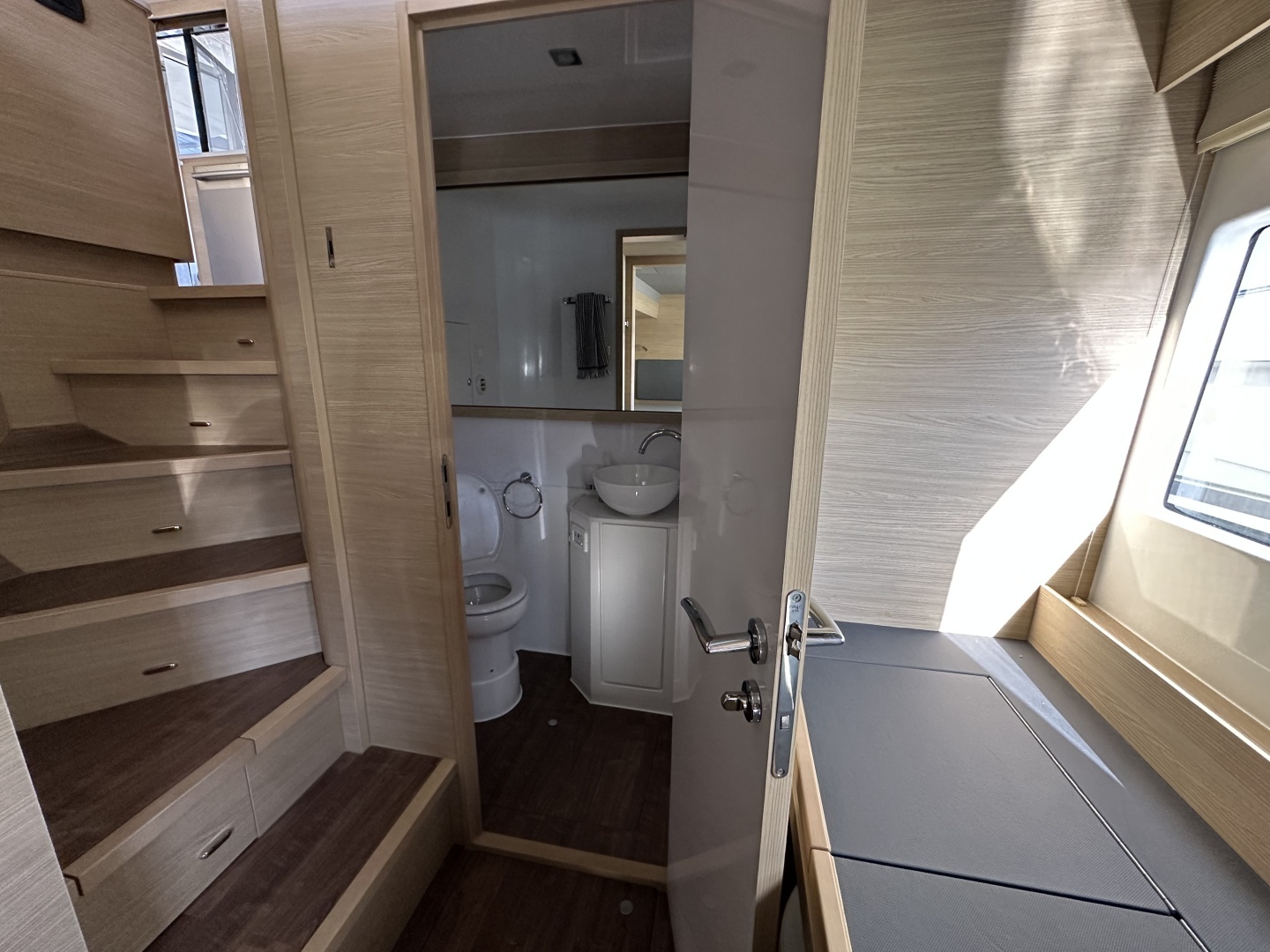 Configured with the preferred 4-cabin / 4-head layout and interior staircase to the flybridge, she offers exceptional functionality and comfort for both private ownership and charter use. The enclosed flybridge further enhances livability, effectively creating a second salon space.