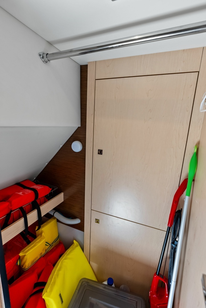 The lower deck landing has a built-in wine cooler and storage with plenty of counter space... From the landing you can access any of the three staterooms and two heads.