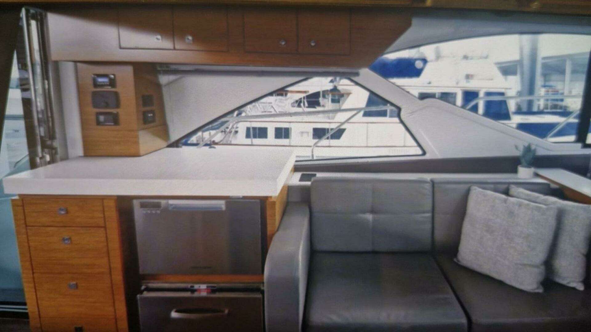 The cockpit has u- shaped seating, cockpit table, bar stools with windows that drop down to open salon, and she has an electric sunshade for the aft deck area and open galley/bar.