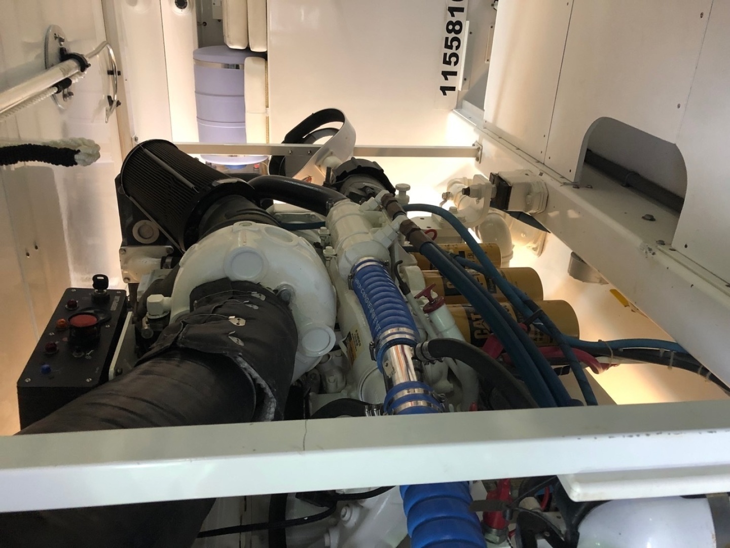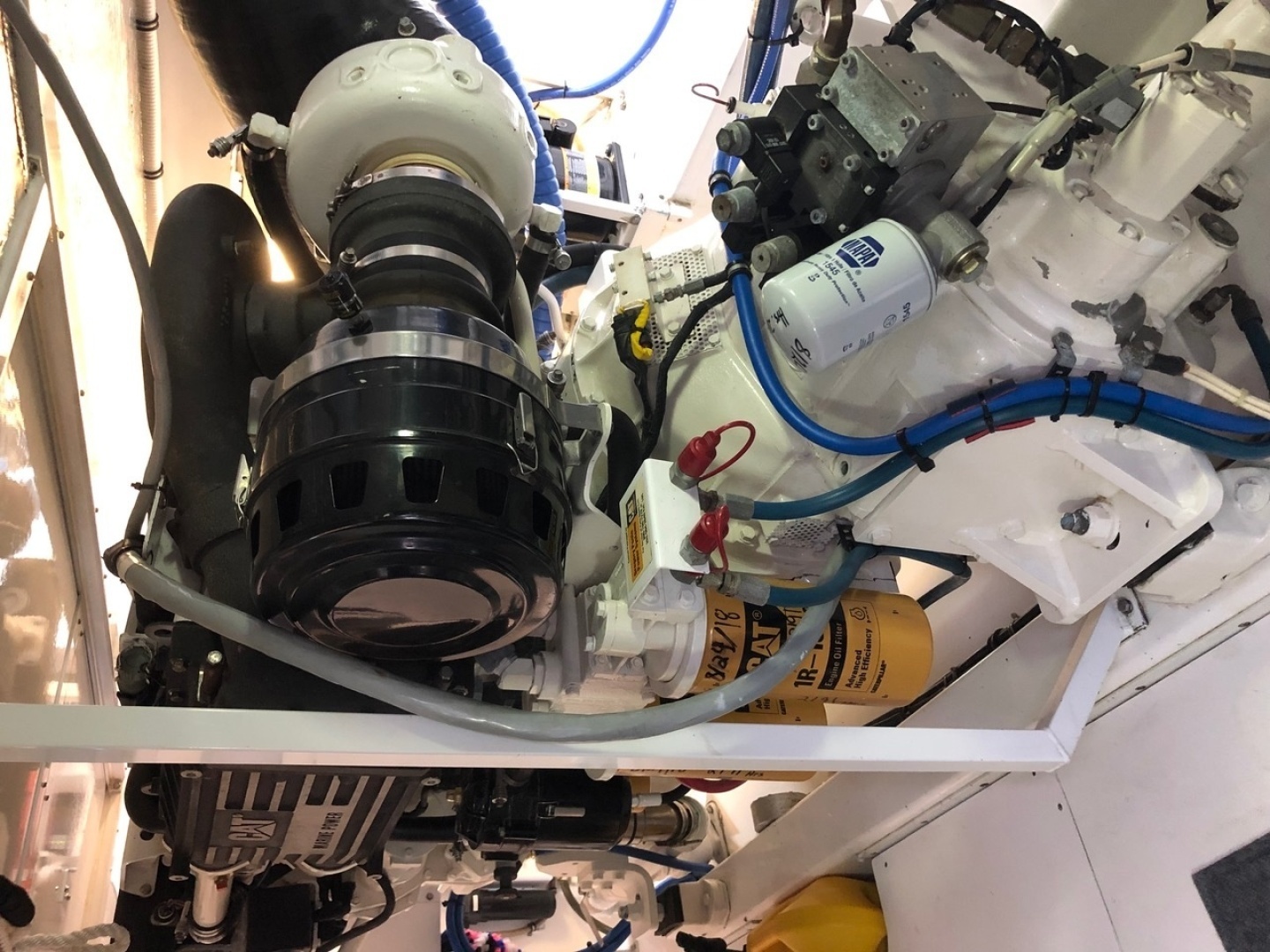 Drop into the engine room with a 15kw Phasor generator to the stern and two 450-gallon fuel tanks to port and starboard with flying gaff storage above, moving forward into the engine room is a pair of Caterpillars C-18’s, attached to ZF 550A gears with trolling valves. Port motor is equipped with power steering pump and everything is protected by Fireboy Xintex fire can that was recertified in September of 2017.