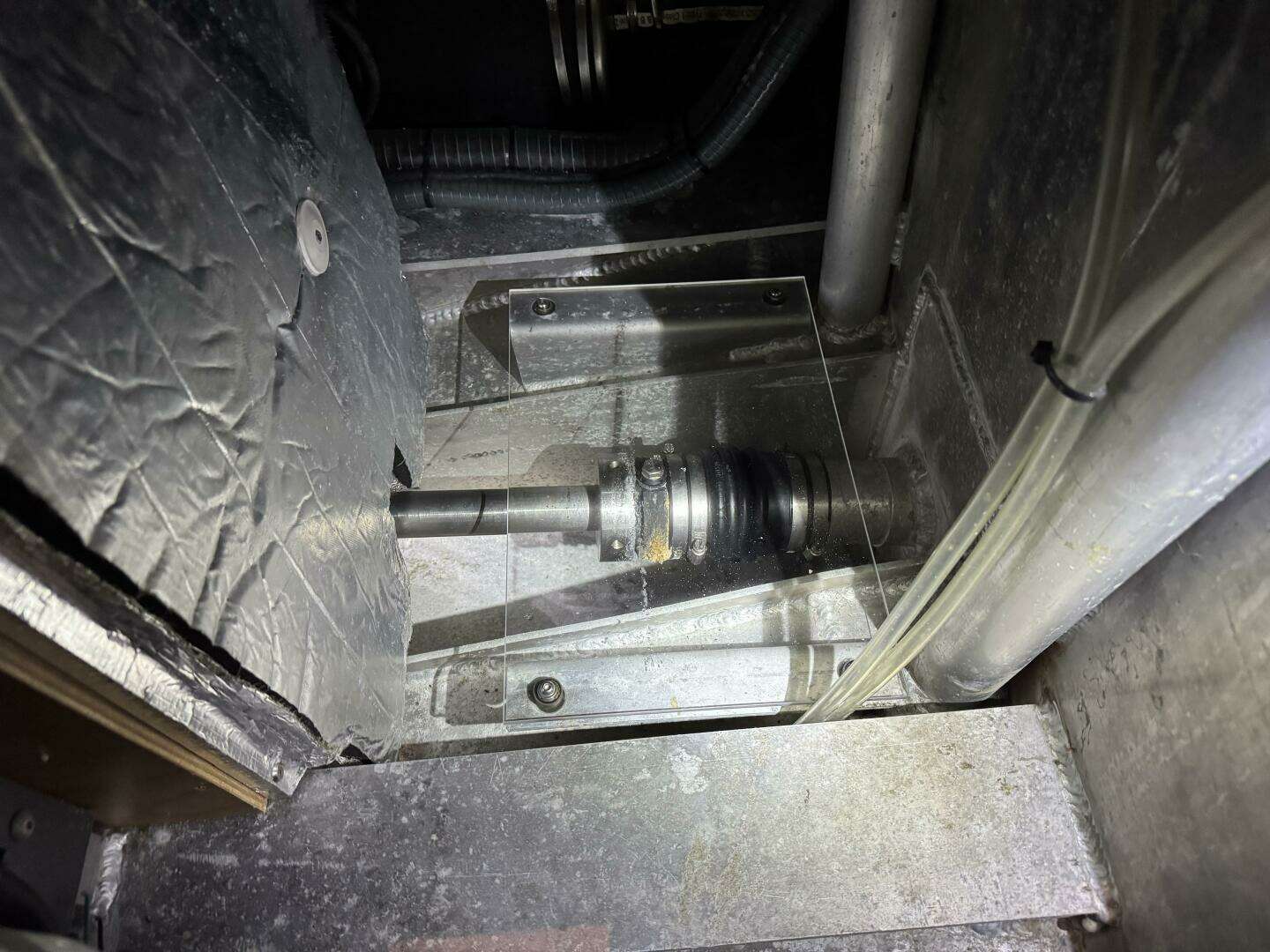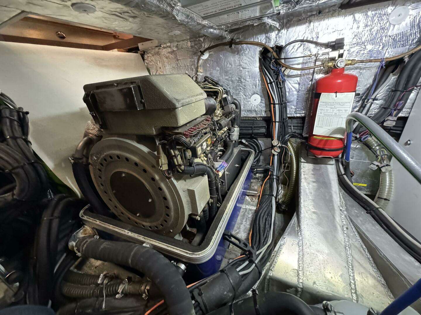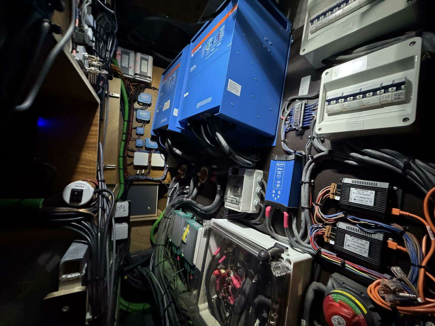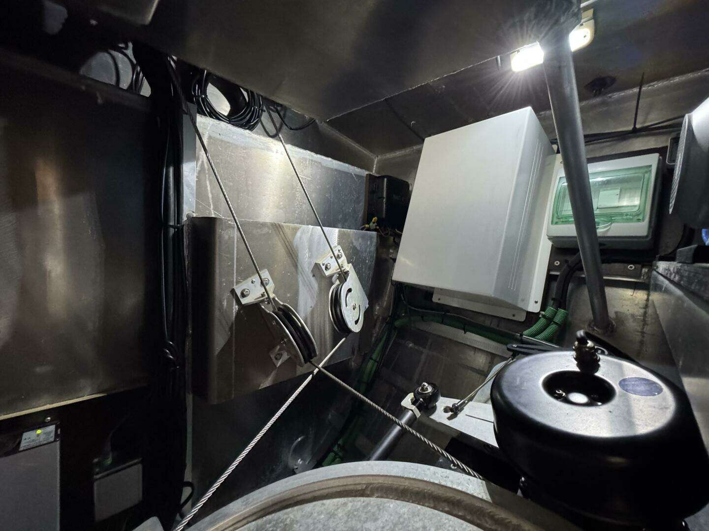 AYSHA’s interior arrangement has the panoramic saloon and galley with a spacious owner’s cabin and ensuite head. The starboard aft VIP cabin has a double berth. The port aft cabin has been converted into an extremely well-equipped workshop with direct cockpit access. The workbench converts into a single berth with additional fold down bunk inboard. The cabin below the raised saloon has been converted for maximum storage space with a fold down pipe berth. The saloon table is convertible to a double berth bringing the total number to 9 sleeping berths. The extra thick insulated sole is (Resopal synthetic) teak and holly and the bulkheads are in a warm Afromorsia (Alpi) paneling. There is radiator heating throughout with heat exchanger forced air ventilators in the heads. The aft head heater also feeds the wet locker outboard of the stall shower and one of the cockpit storage cubbies. Air conditioning in the owner’s and port aft cabins has proved more than adequate for comfort on board. Sole traps are positive locking and there is good access to all systems below the sole. LED spots and indirect lighting throughout the boat are dimmable with courtesy lights below steps. 220v, 12v and USB outlets are scattered throughout the interior.
