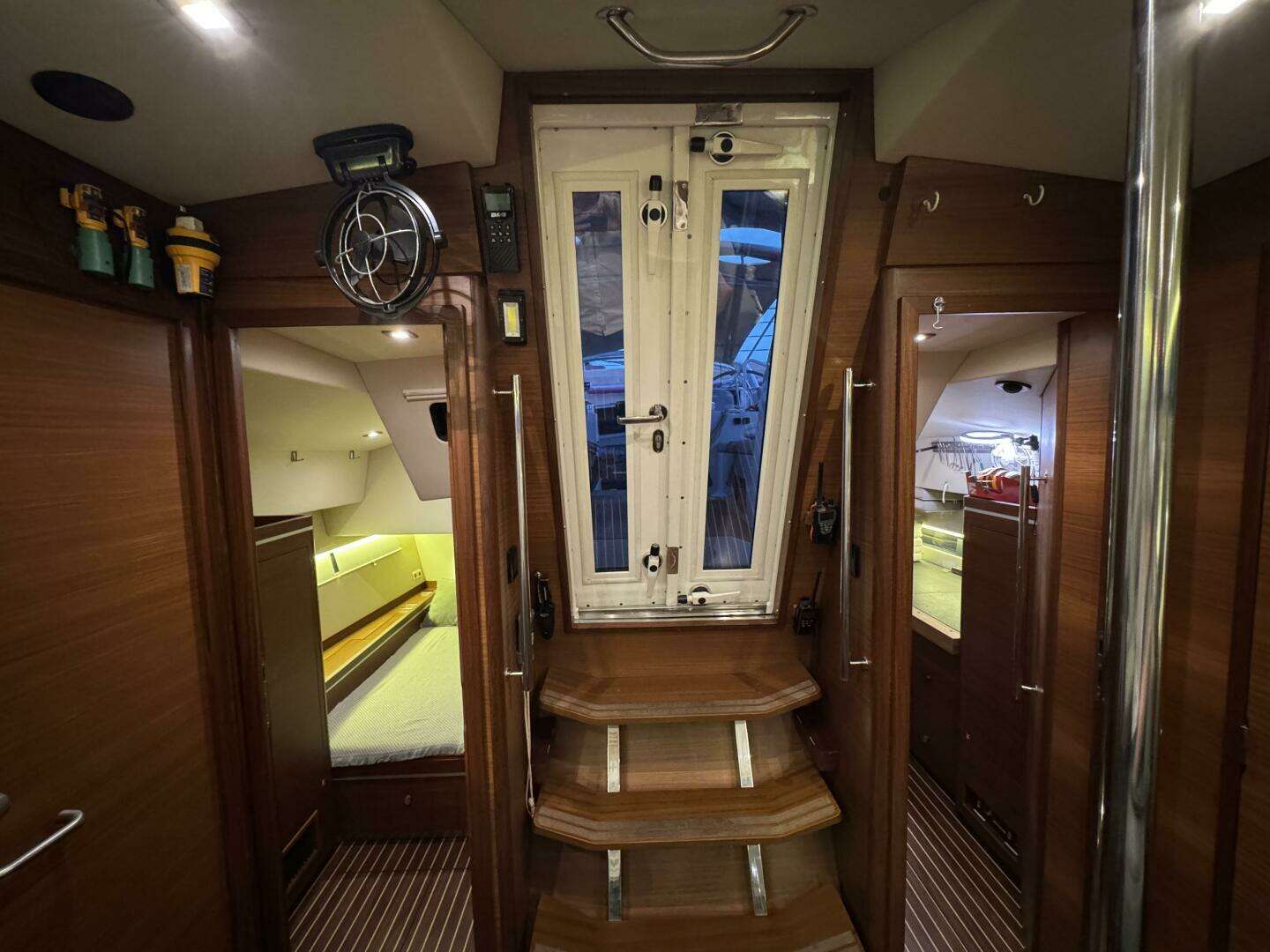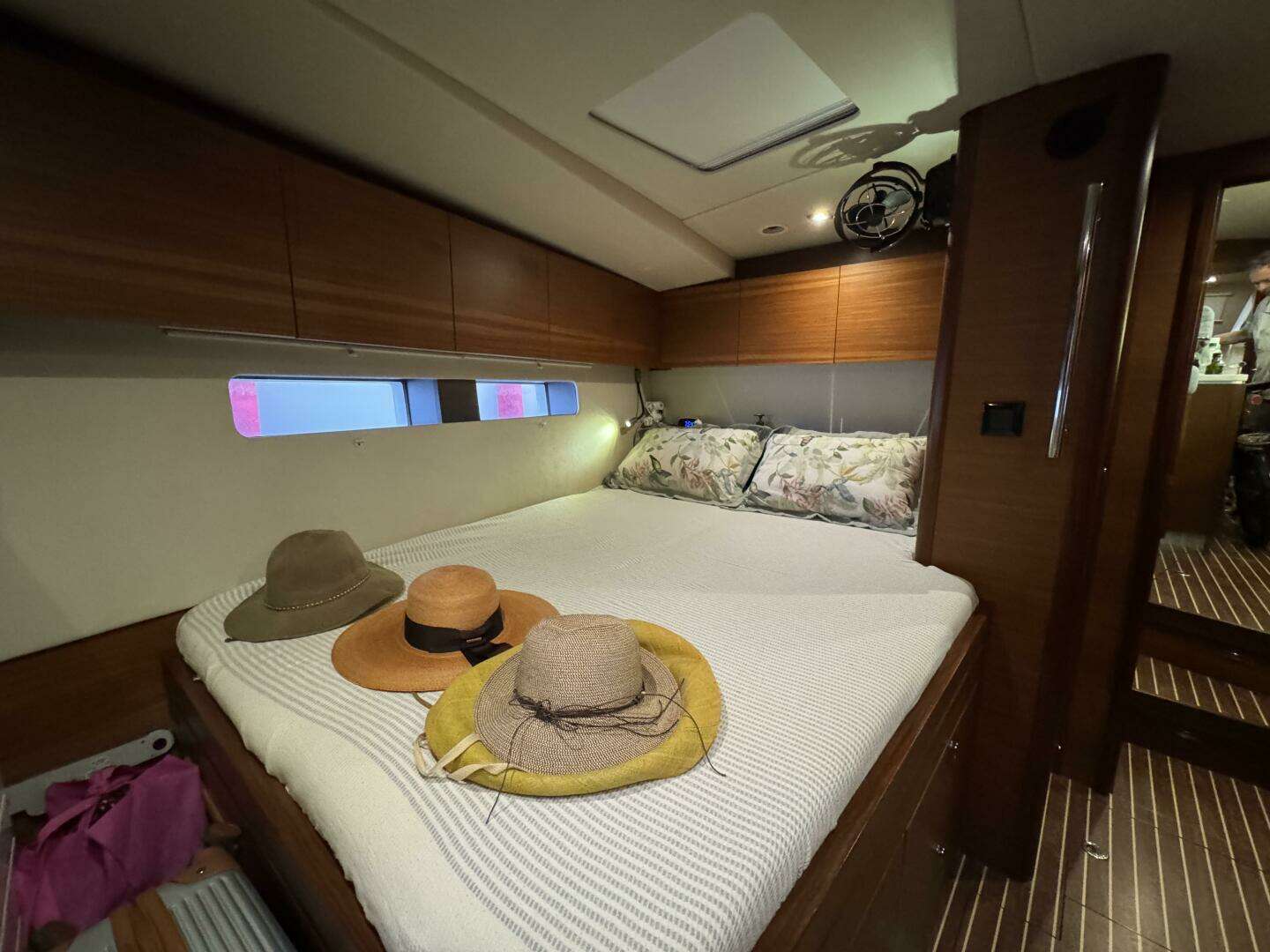 The starboard aft guest (VIP) cabin has two fixed portlights in the hull and two portlights opening into the cockpit.