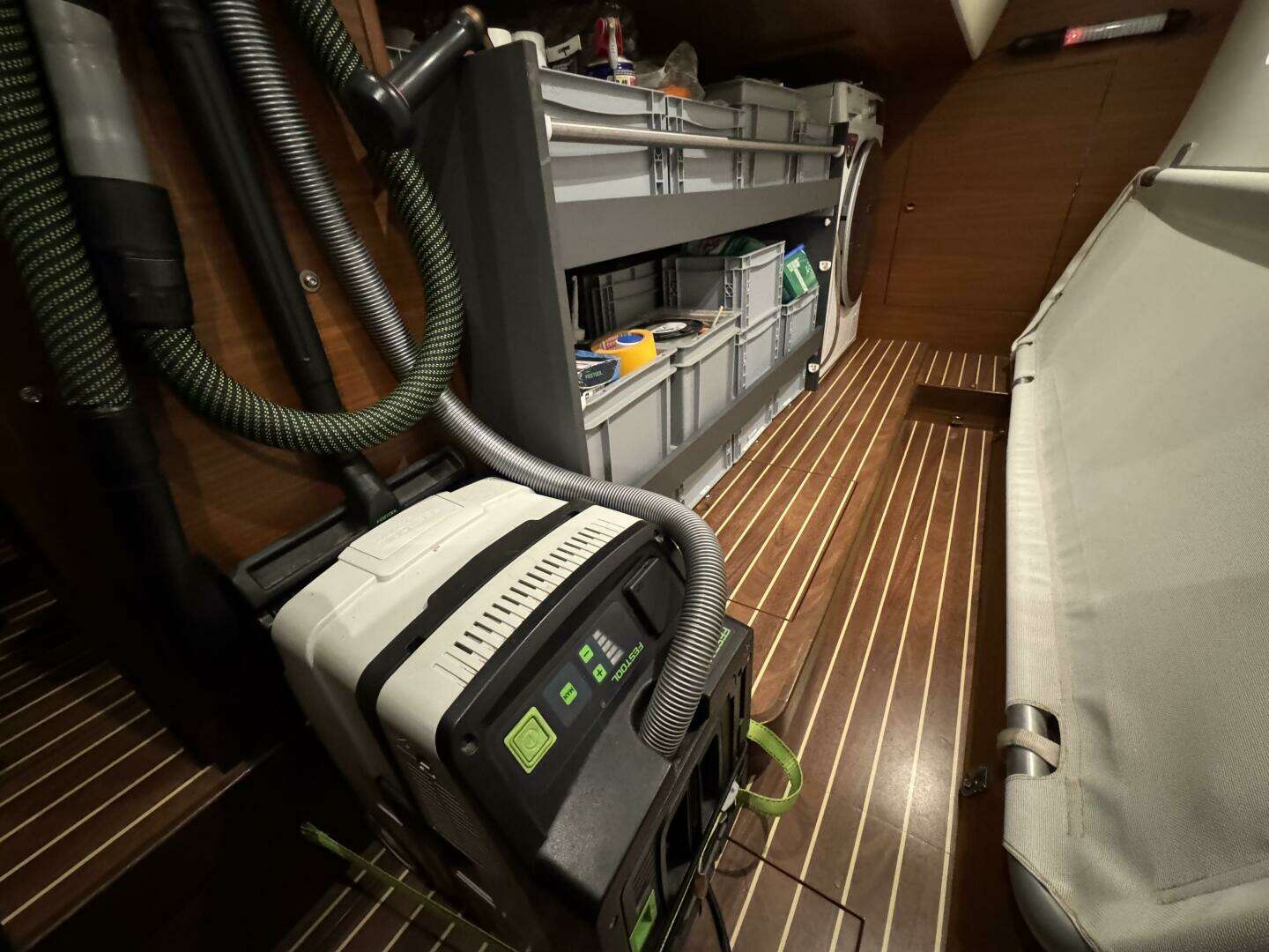 * Extensive set of spare running rigging, pumps, electrical and plumbing parts for world cruising. Extensive set of high-quality hand and power tools (Festool drill, orbital and belt sanders and shopvac) and a sewing machine are included.