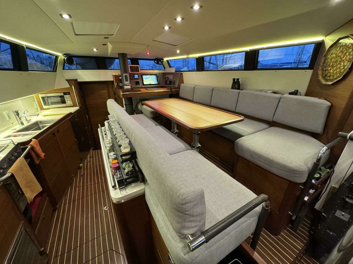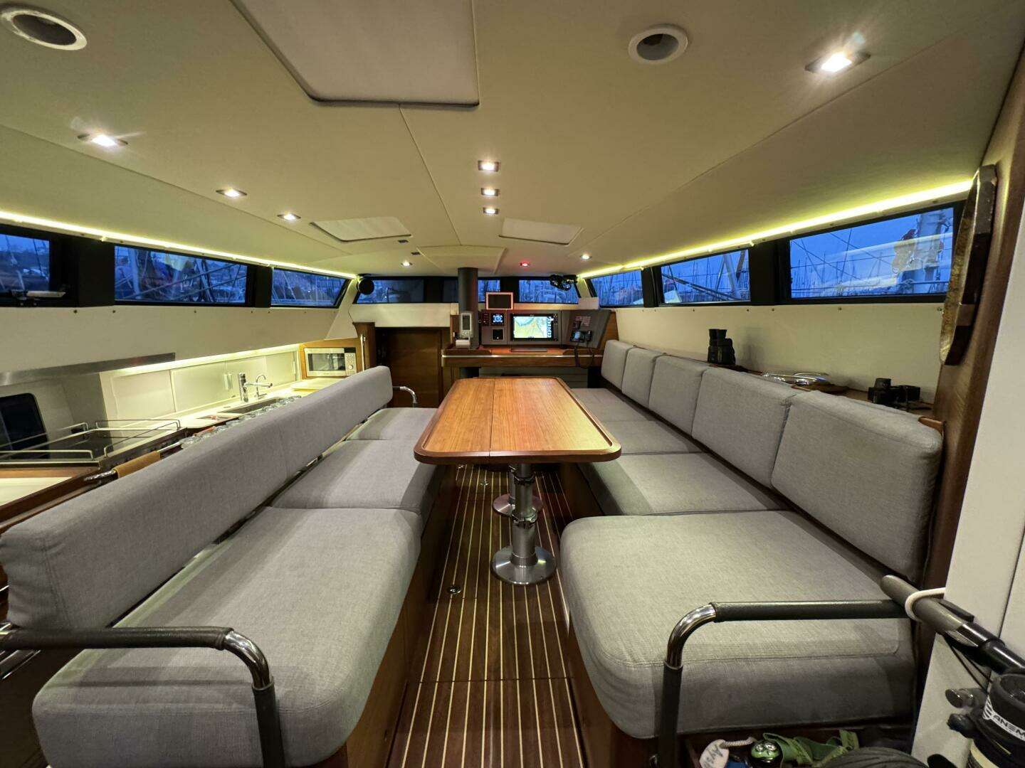Through the watertight double companionway door with key lock and 4 hatch dogs is the panoramic deck saloon. This features a forward-facing navigation station that is often referred to as “Jimmy’s desk”. When conditions are sub-optimal and everything is in good trim on deck, this is the most comfortable location to stand watches. A u-shaped settee to starboard faces the convertible table (with leaves for easy movement fore and aft) and a centerline bench settee with galley storage drawers.