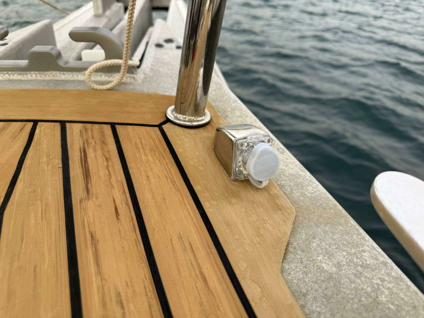 * Flexiteek synthetic decking with black caulking lines. Decking on foredeck, side decks, in cockpit and swim platform.