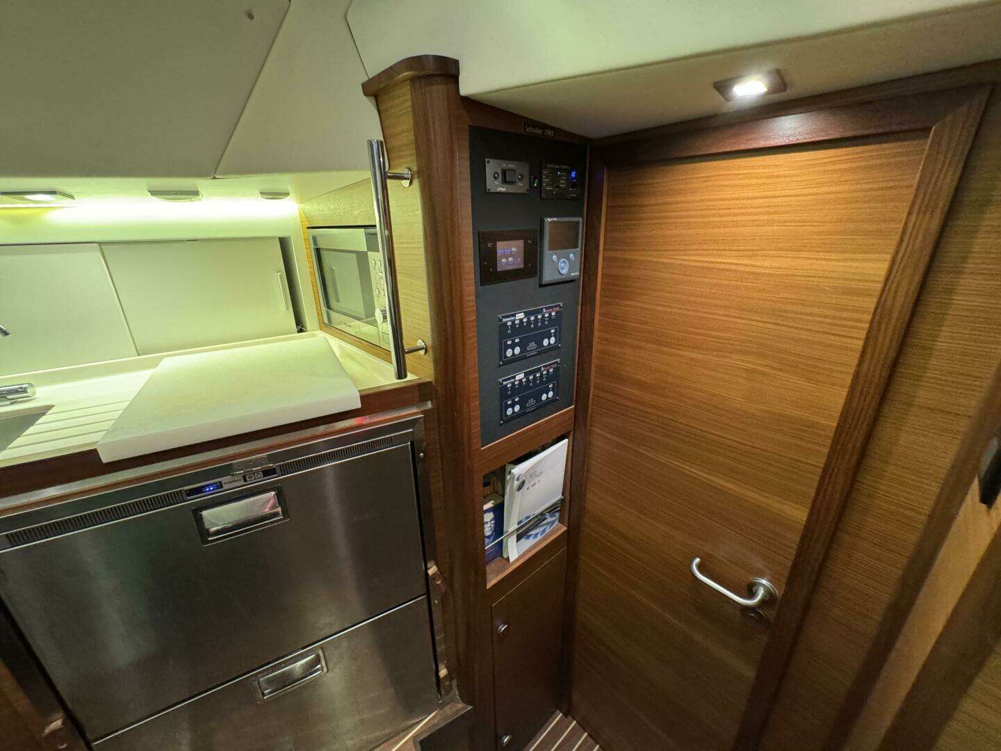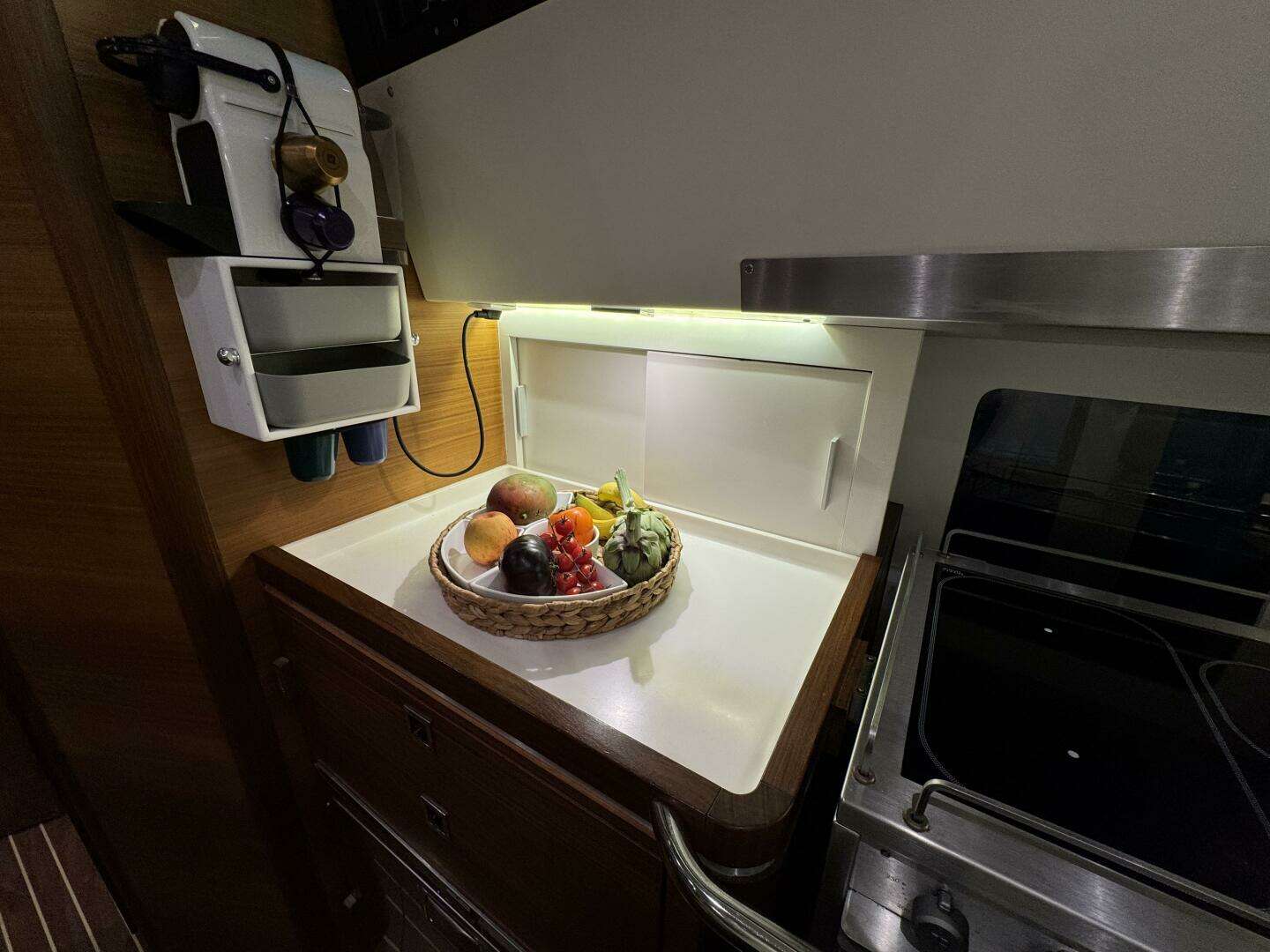 * A Nespresso coffee machine is mounted on the aft bulkhead.