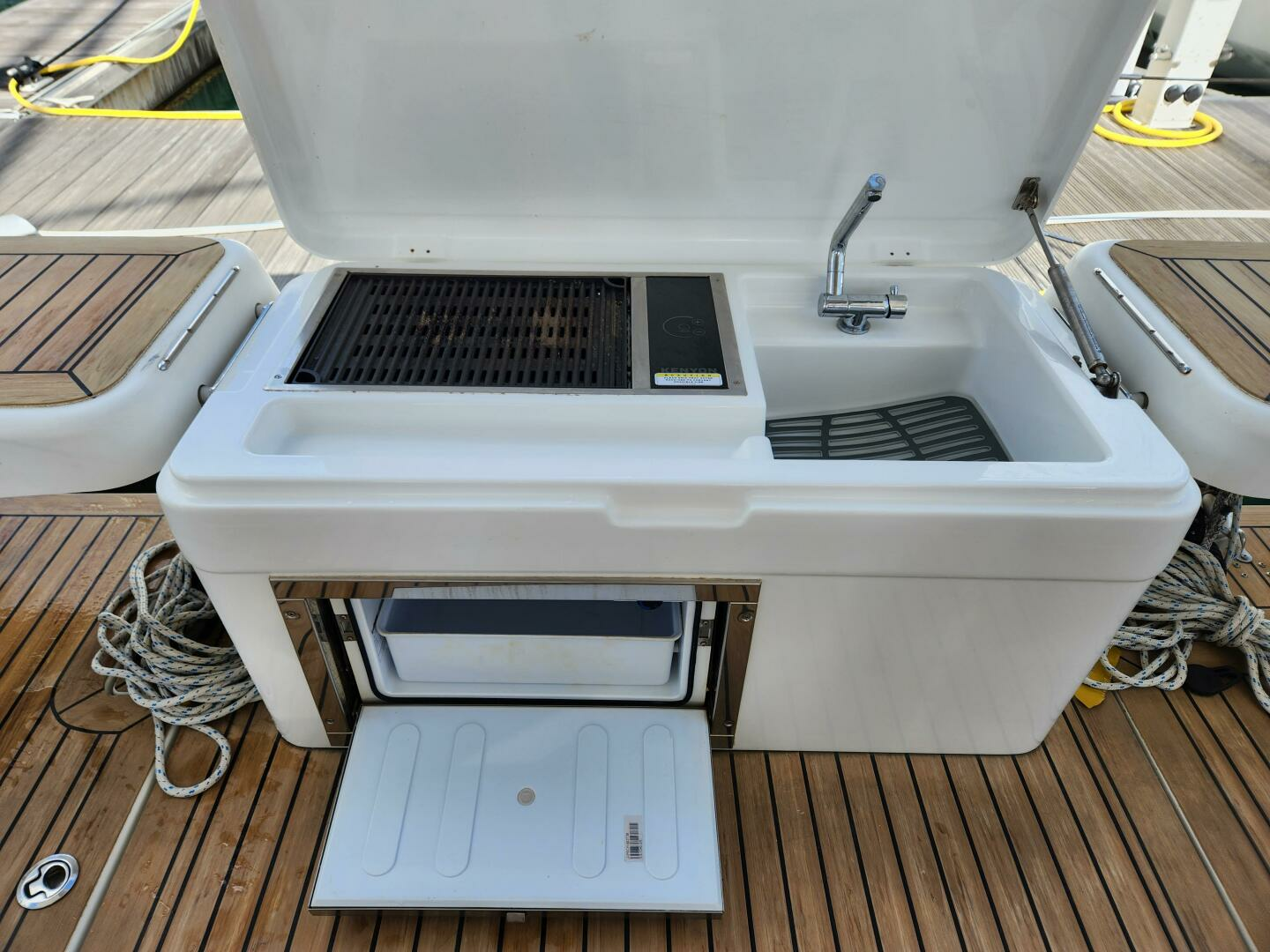 Details such as the Ultra Anchor which sets every time continue to provide confidence and comfort. When at anchor and night falls, the lighting built into the hard top provides an exceptional place to relax. We use the electric grill, at the back of the cockpit all the time and clean up is easy with the adjacent sink, followed by a cool one from the fridge under the grill.