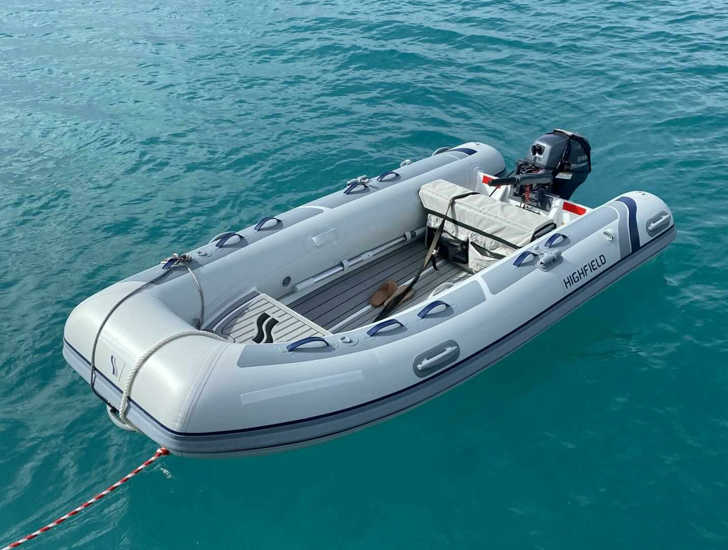 To go ashore, lower the Highfield dinghy from the davits and close the transom door remotely as you leave. Come back and quickly hoist it back in position. Sure beats dragging a dinghy behind the boat all day!
