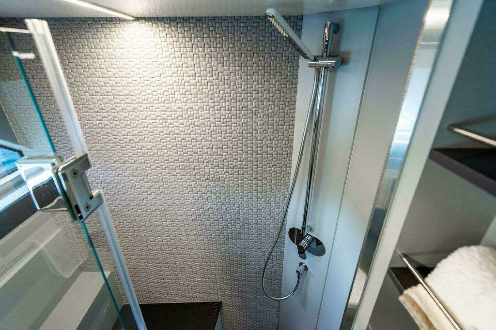 Lacquered elements, essentials, and pristine white Vescom wallpaper are used to decorate the sleeping suites. Bedspreads and cushions by Zimmer + Rhode and Casamance, in addition to a pair of decorative lamps by Cini & Nils in the master suite, complete the decoration of the first hull. The bathrooms, with ceramic top and basin, can be further equipped with decorative mosaics on the shower walls. On the first unit that was presented in Cannes, the master bathroom featured a mosaic in light grey tones called “Pulsar Chrono” by Mosaico+.