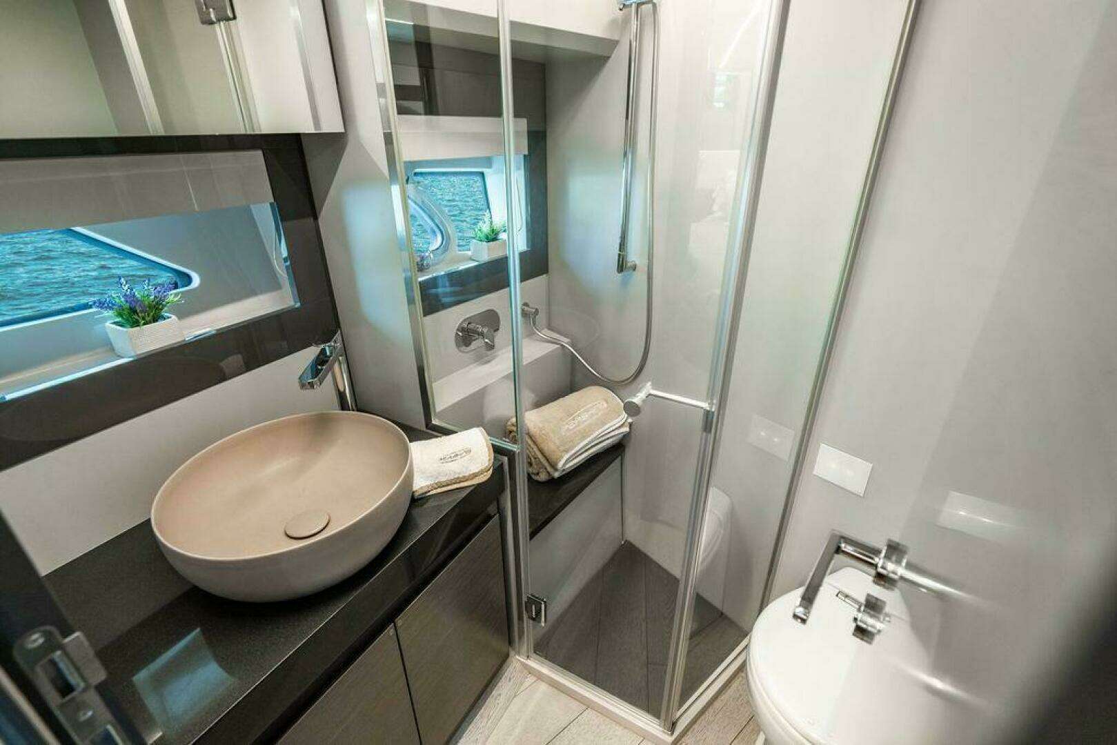 Alternatively, the owner may opt for twin CAT 12.9 engines, with 1,000 HP each, and Top System 75X surface drives (cruising speed 41 knots, maximum speed 45 knots - preliminary data), to which you can add the EASYJET system, that is usually reserved for larger vessels.