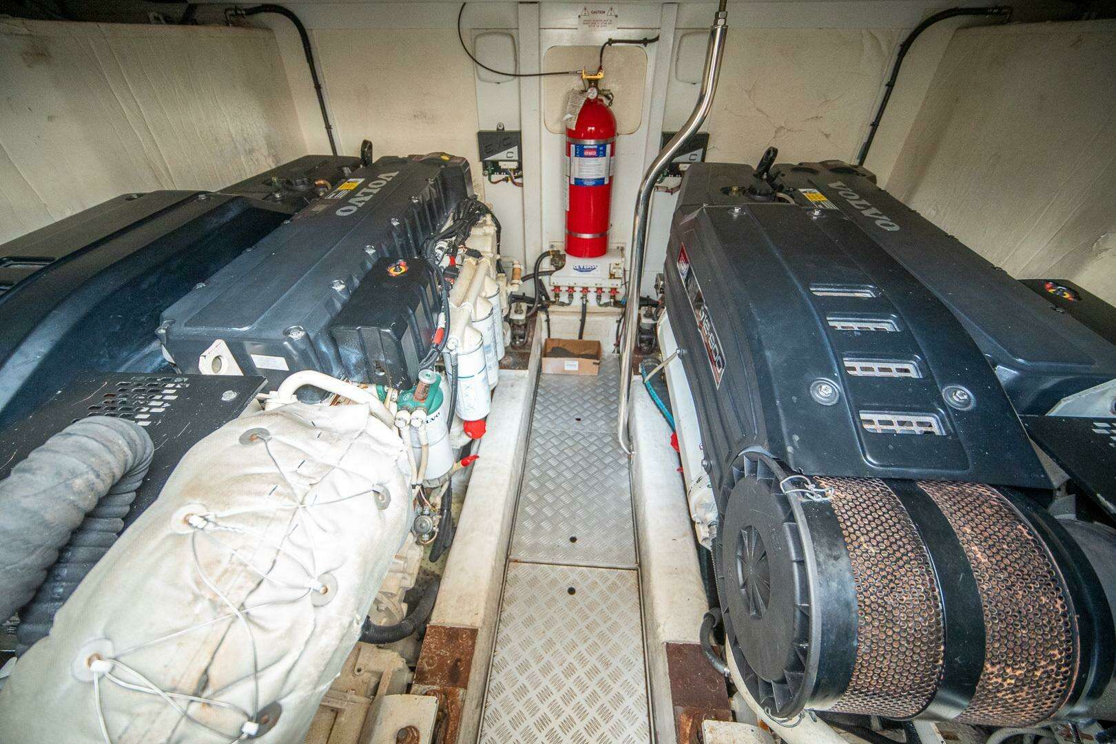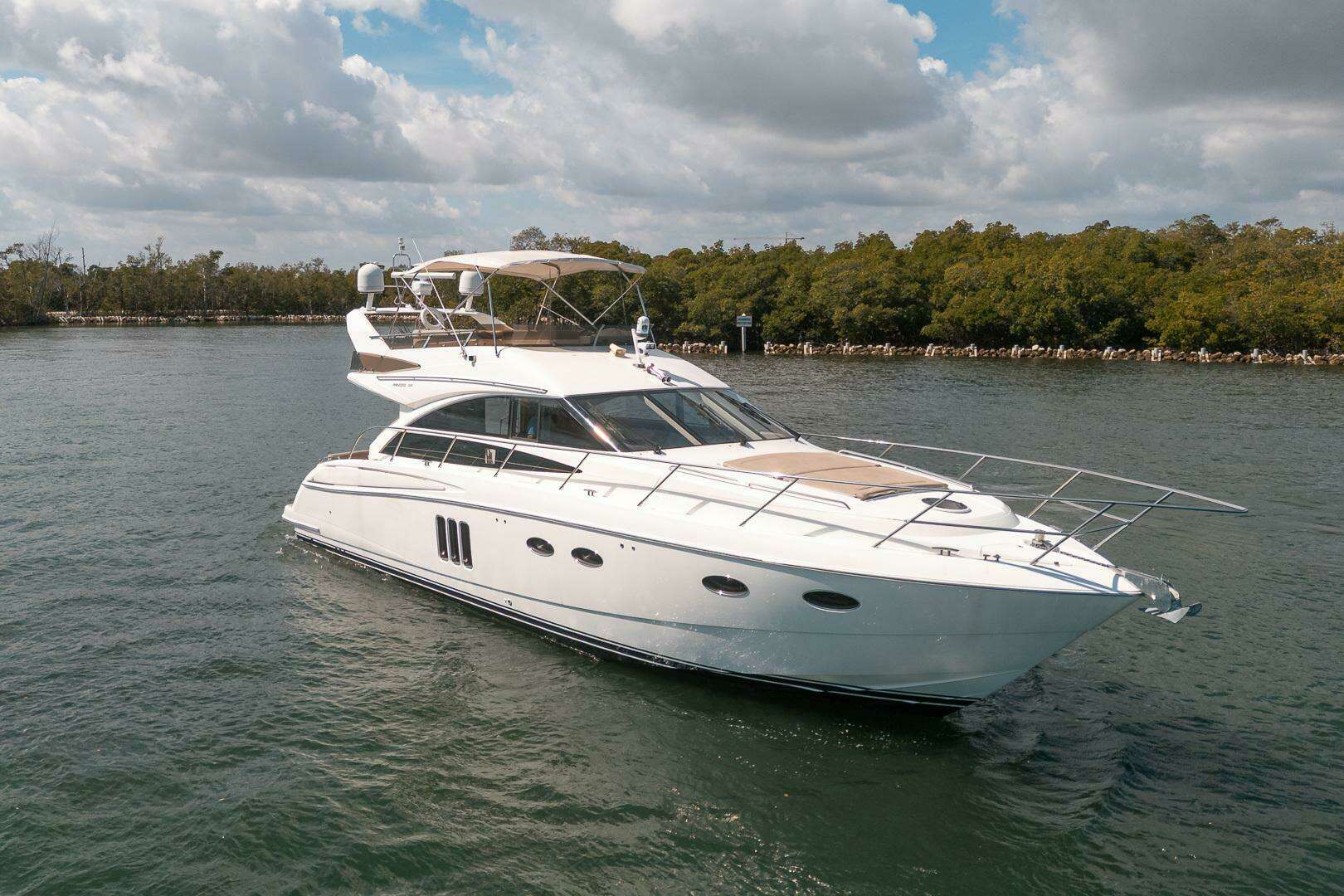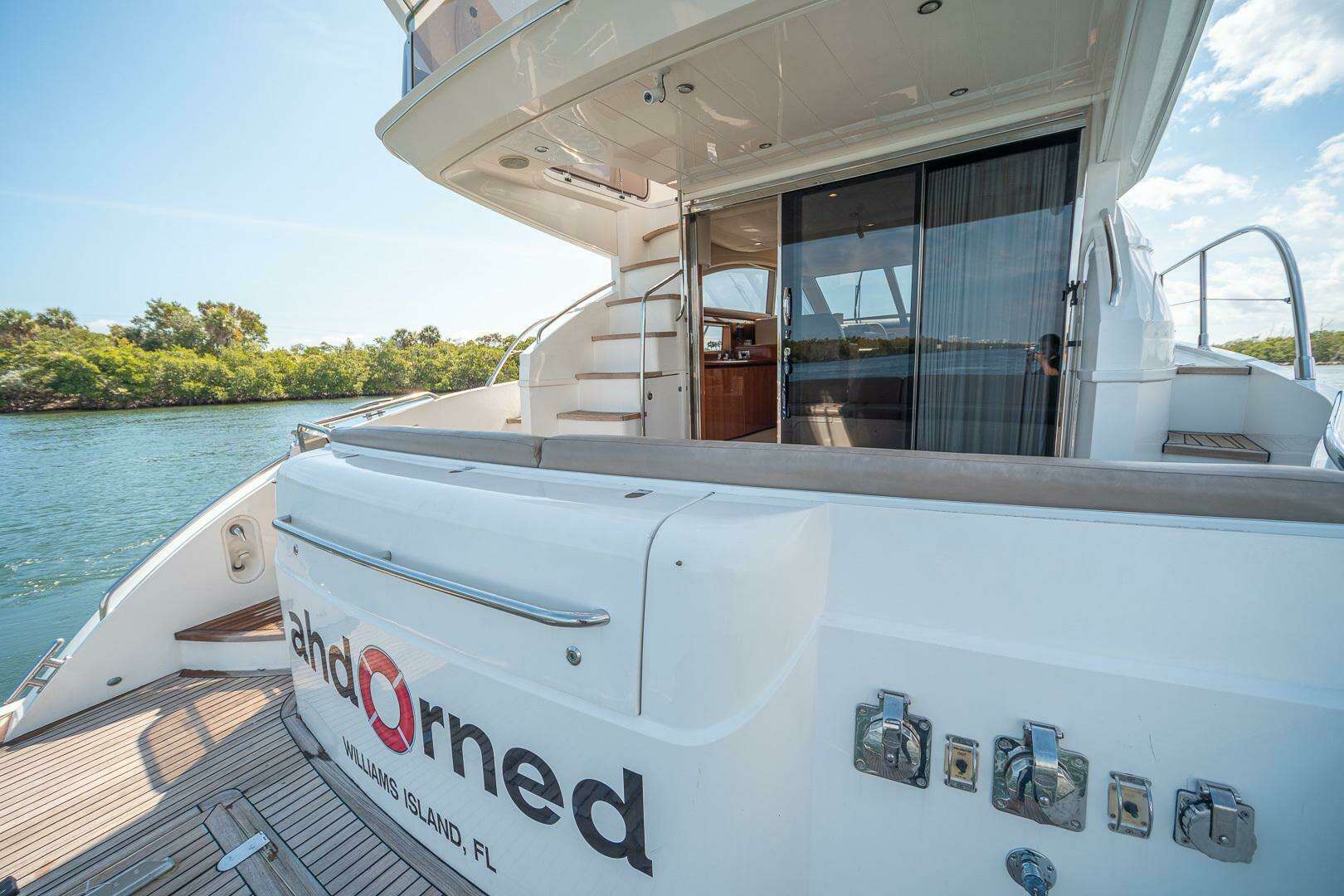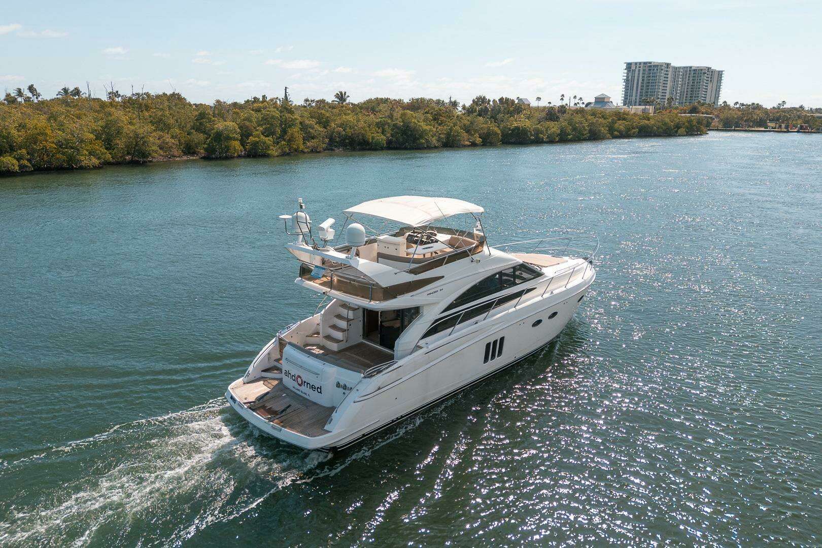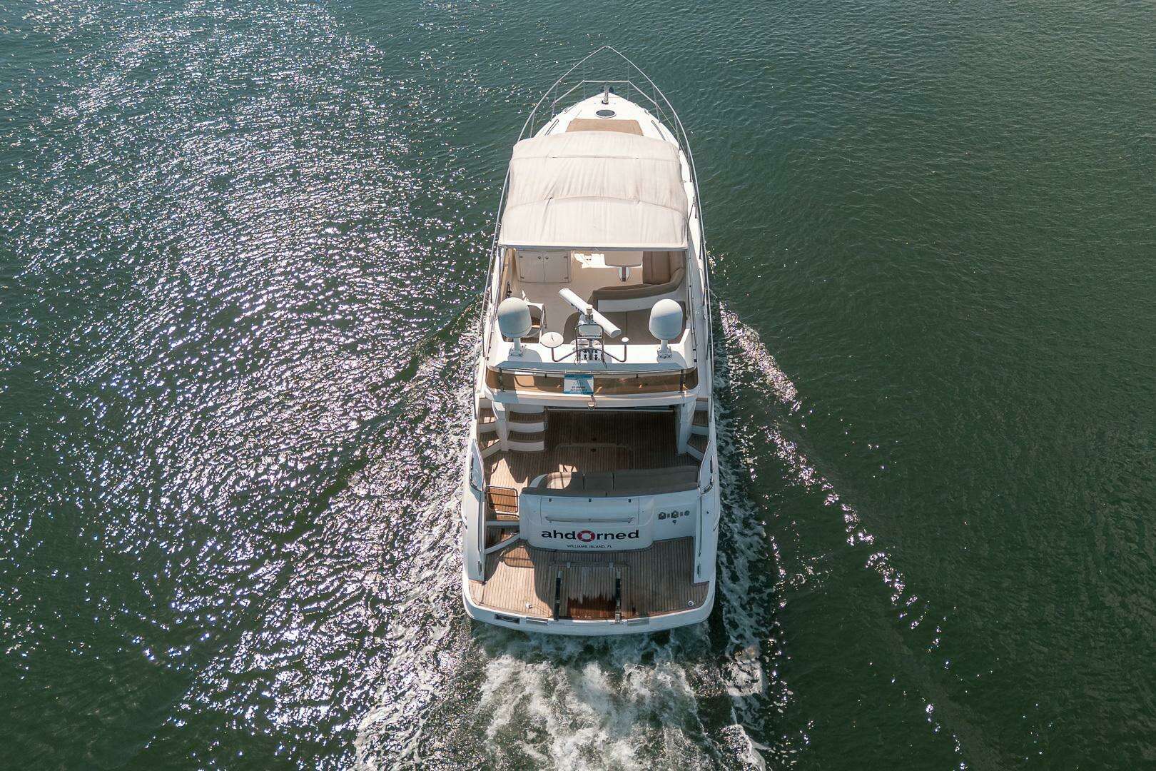 AHDORNED is a 2009 Viking-Princess Yachts 54 Flybridge powered by twin Volvo D12-800 engines producing 775 horsepower each and propelling her to a top speed of 34 knots.