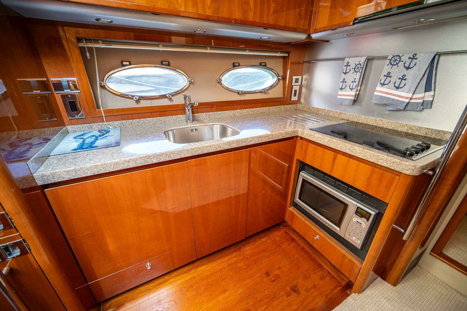 AHDORNED is a 2009 Viking-Princess Yachts 54 Flybridge powered by twin Volvo D12-800 engines producing 775 horsepower each and propelling her to a top speed of 34 knots. She boasts three staterooms including a full-beam master with ensuite head. AHDORNED has a molded-in swim platform with teak overlay and port transom gate that leads to the cockpit with also teak overlay, bench seating on the transom and freshwater shower to port. Port of the cockpit there are steps that lead up to the flybridge which comes fitted with dual helm seats forward and to port, U-shaped seating with table to starboard, sun pad aft, fiberglass arch aft and Bimini top forward of the arch. Side decks take you to the forward deck with over-sized sun pad. Access to the interior is through the glass sliding doors in the cockpit. Main salon comes equipped with U-shaped leather settee with wood dinette table to starboard and wet bar/entertainment center to port. Forward and to starboard of the main salon is the dual helm seat to starboard and a U-shaped guest seating with table directly across. Center line steps lead down to the galley to port and the guest double bunk cabin to starboard. Forward and to starboard of the guest cabin is a private head and shower. Continuing forward is the forward stateroom. Aft of the galley is the main stateroom with en-suite head/shower to port.