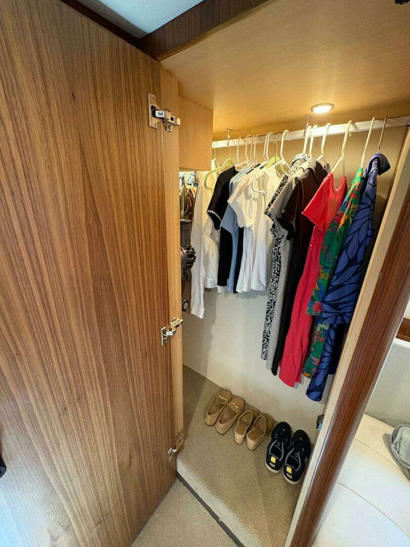 There are his and hers cedar hanging lockers with automatic lighting to port and starboard, with additional cabinetry to port and a private lounge to starboard.