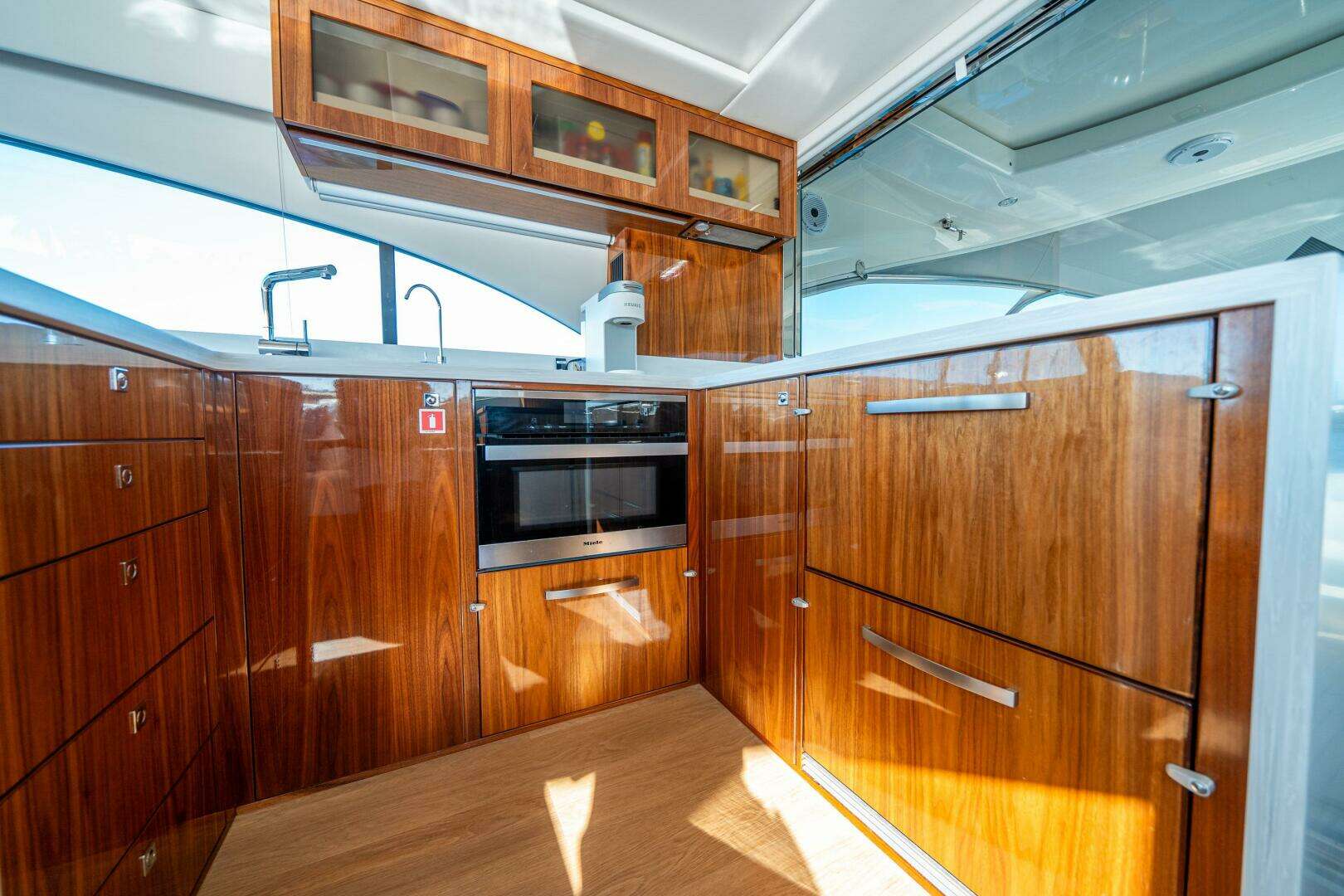 Below deck, WATERDOG offers a three-stateroom, two-head layout, highlighted by a full-beam master suite with a private ensuite. Every detail reflects Riviera’s commitment to craftsmanship and comfort, from the high-gloss timber finishes to the thoughtful integration of light, texture, and space.