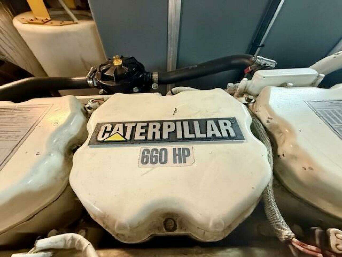 Performance is equally impressive. Powered by twin Caterpillar diesel engines — typically the 3196 model producing around 640 to 660 horsepower each — the 540 delivers cruising speeds in the 20-knot range and can reach top speeds near 25 knots. The modified-V hull and wide beam provide excellent stability and a smooth, dry ride in a variety of sea conditions. With fuel capacity of approximately 800 gallons, she is well-suited for long passages or island-hopping adventures.