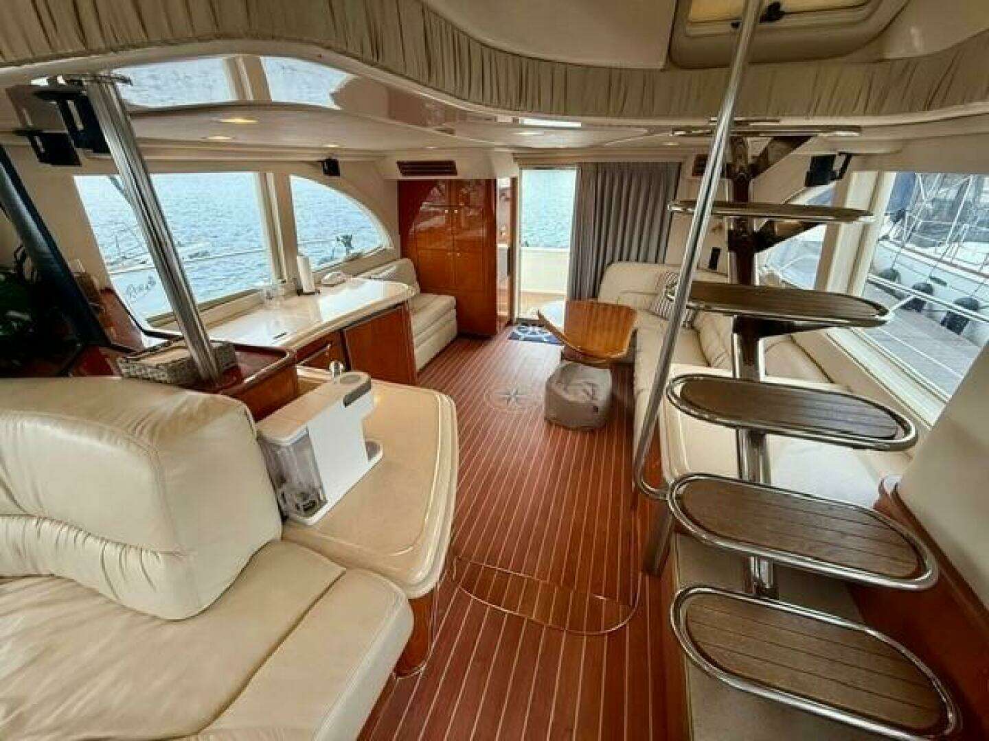 Inside, the yacht reveals a spacious and luxurious interior, finished in high-gloss cherry wood and outfitted with premium fabrics and materials throughout. The main salon is open and bright, with large side windows allowing in natural light and providing sweeping views of your surroundings. Plush seating invites relaxation, and a well-integrated entertainment center ensures you’re never far from comfort or convenience.
