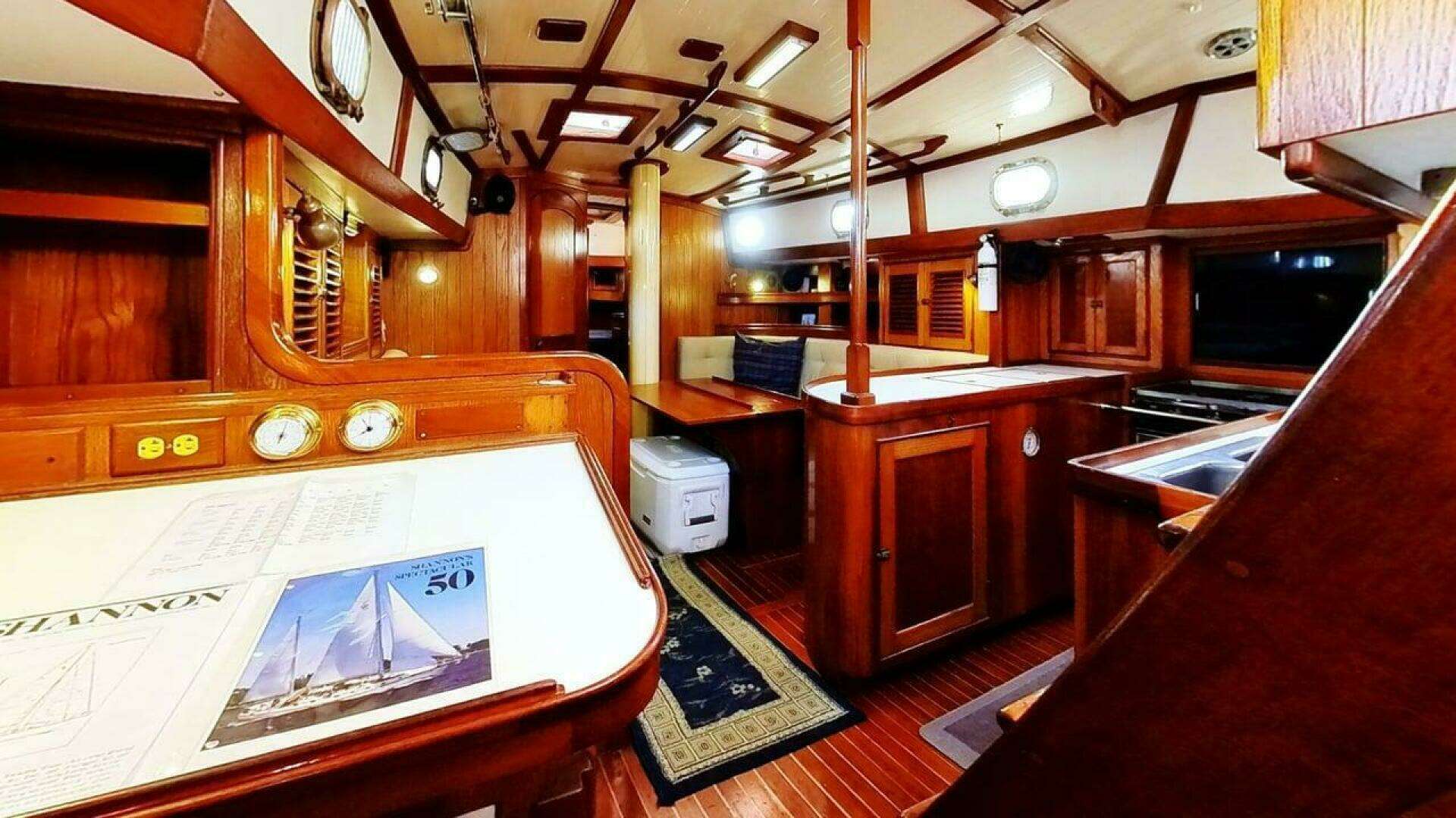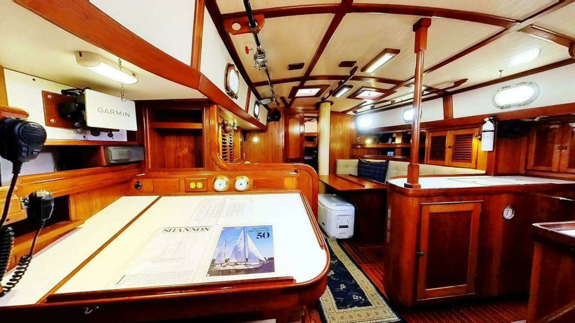 Conmara is one of the most desirable Shannon Aegean 51 center-cockpit models, featuring a forward pilothouse and generous interior layout. The craftsmanship reflects Shannon’s devotion to tradition and quality. Bulkheads are finished in light oak with varnished teak trim, while the ceilings are hand-selected mahogany. Eighteen bronze opening ports, multiple dorades, and five deck hatches flood the cabin with natural light and ventilation.