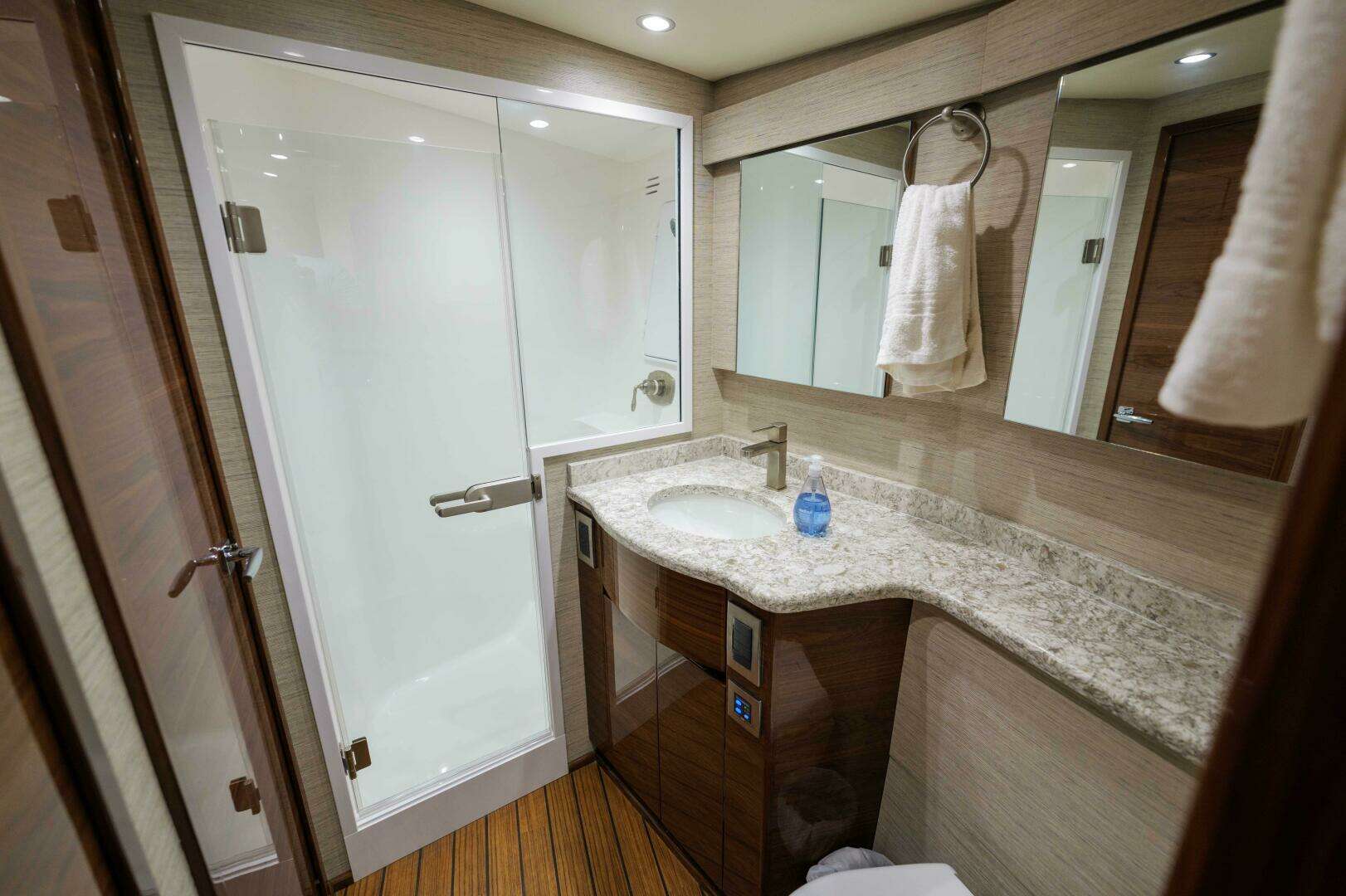 - Walk-in shower with a one-piece custom frameless glass shower door