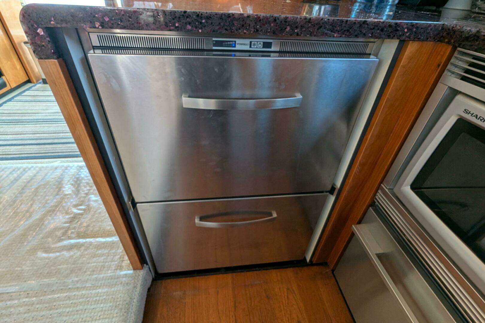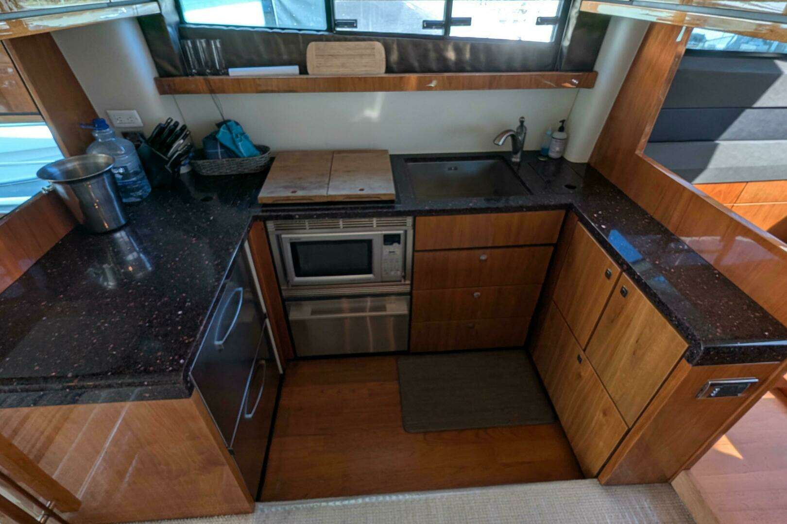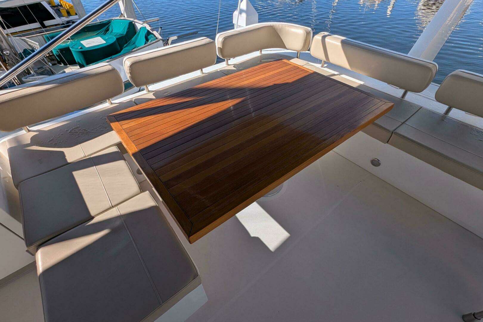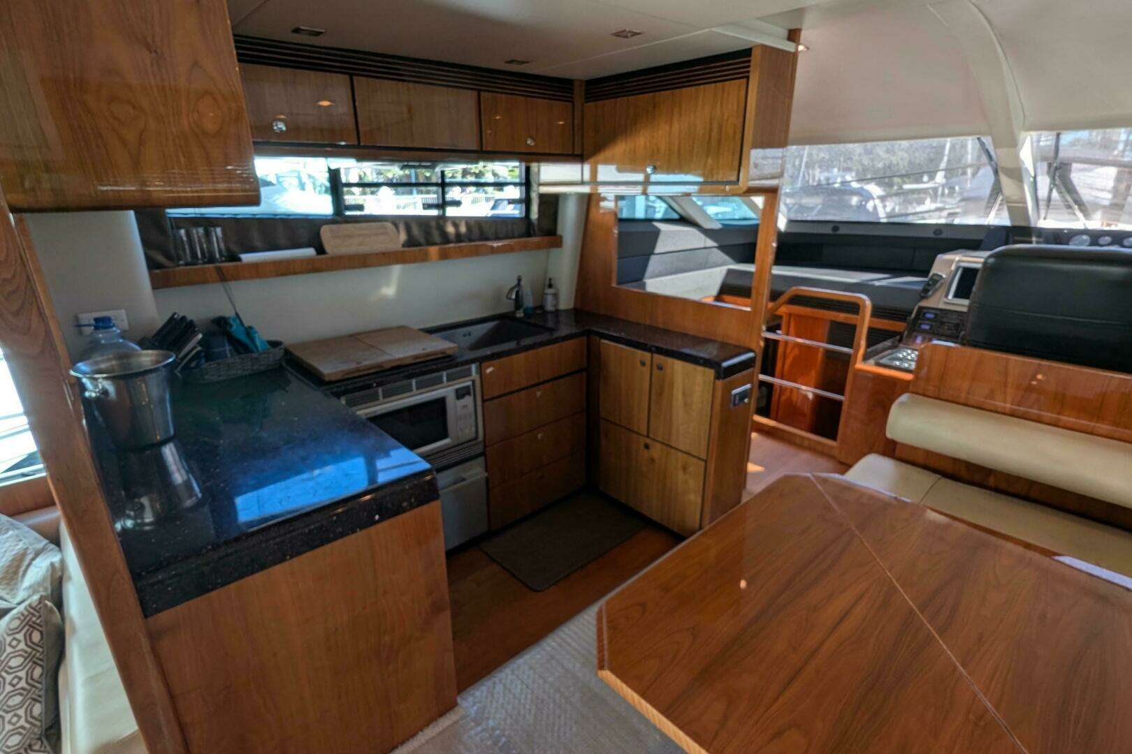 Above, there is an inside helm with a full suite of electronics, followed by a well equipped up-galley with granite countertops and stainless steel appliances. Opposite is a dinette with a folding wooden table that can seat 6 for dinner.