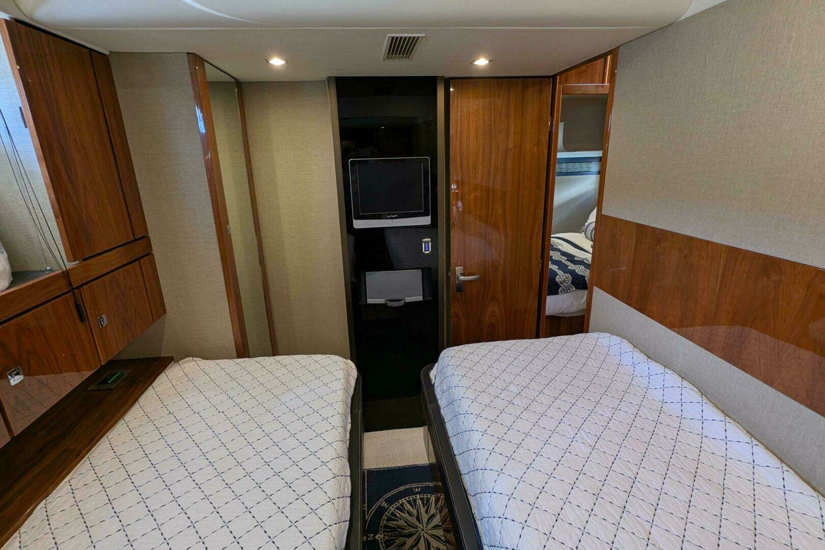 Inside, there are 3 staterooms: A full-beam master with en-suite head & shower; a VIP with centerline queen berth; and a guest cabin with twin singles. The latter cabins are served by a second day head. The woodwork throughout is high-gloss cherry, in lovely condition, while underfoot is soft carpet that was replaced not long ago.